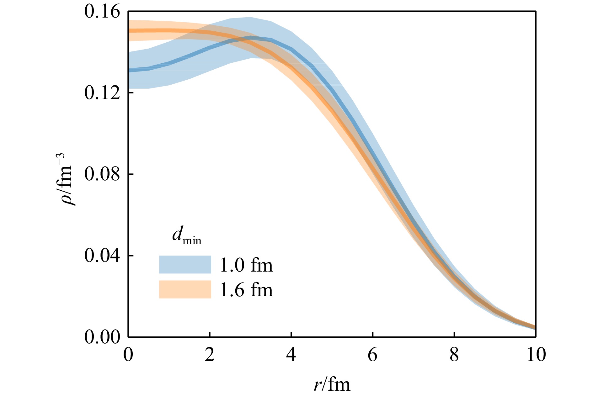 $ \rho_0^{} $ = 0.16 fm−3是核物质饱和密度;$ A $ 为抽样原子核的质量数。初始化后原子核的结合能、均方根半径等与其实验相近,能很好描述其基态性质[51-52]。在对每个核子的坐标进行抽样过程中,将计算每两个核子质心之间的距离