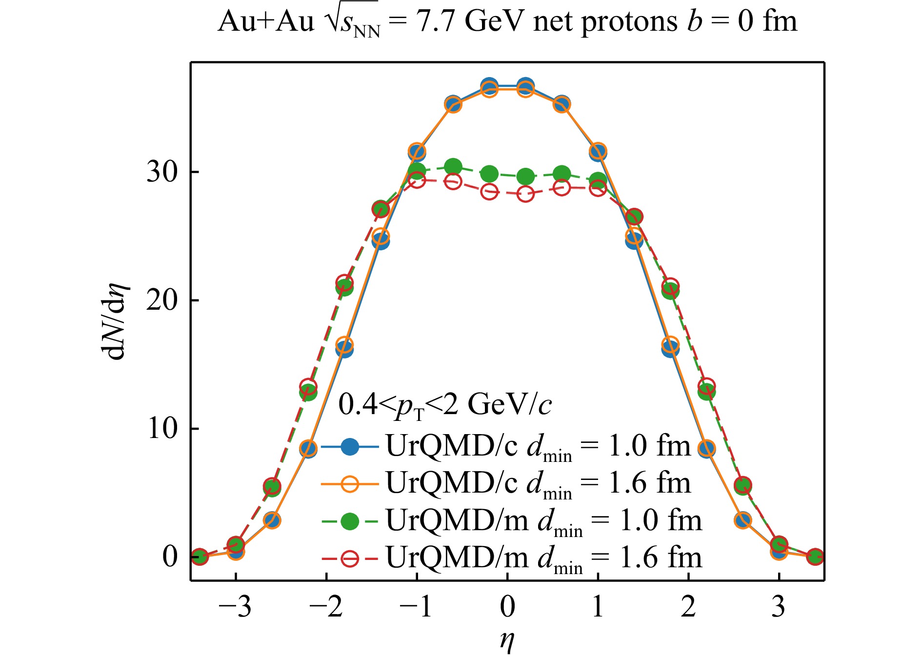 $ d_{\min}^{} $ 参数得到的净质子赝快度分布。结果发现,在所研究的$ \sqrt{s_{\rm{NN}}^{}} $ = 7.7 GeV能量下,在考虑平均场势相互作用之后,净质子产额分布出现了明显的降低,表明在此碰撞能量下势相互作用仍不可忽视。此外,改变$ d_{\min}^{} $ 参数,发现其在级联模式下的影响不显著,但在平均场模式下,较小的$ d_{\min}^{} $ 会引起产额的增加。这是由于平均场模式下采用了密度依赖的相互作用性质,同时从图1可以看出,$ d_{\min}^{} = 1.0 $ fm会引起较大的初始密度涨落,因此$ d_{\min}^{} $ 的改变会在势相互作用存在的模式中有着更加明显的影响。 -