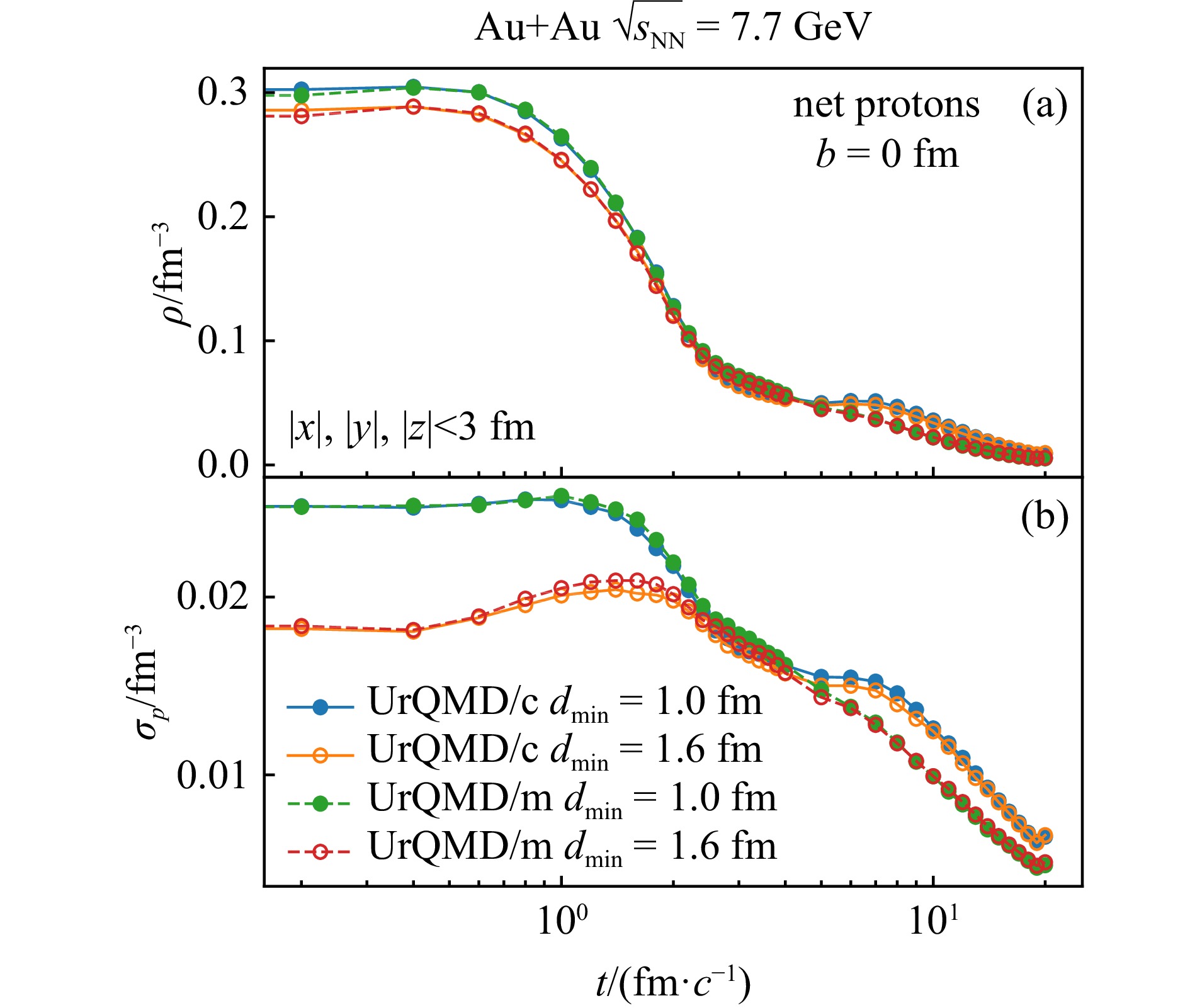 $ |x|, |y|, |{\textit{z}}|<3 $ fm)中,净质子数密度$ \rho $ (a)及其标准偏差$ \sigma_{\rho}^{} $ (b)随时间的演化。可以看到,首先,在相同的$ d_{\min}^{} $ 值下,反应前期(即压缩阶段)平均场模式下由于势相互作用,核子间具有排斥力,所以UrQMD/c(实线)得到的密度稍大于UrQMD/m的结果(短划线)。之后,由于火球的膨胀,在$ t>1 $ fm/c之后粒子逐渐离开中心区域,导致密度逐渐下降。其次,从图3(a)中可以看出,当$ t \leqslant 2 $ fm/c时,在$ d_{\min}^{} = 1.0 $ fm的情况下得到的密度与$ d_{\min}^{} = 1.6 $ fm时得到的密度接近。然而,随着时间的演化,在$ t>2 $ fm/c时,$ d_{\min}^{} $ 引起的密度差逐渐消失,这意味着$ d_{\min}^{} $ 对密度的影响可能在火球膨胀阶段被抹去。最后,从图3(b)中可以看出,$ d_{\min}^{} $ 对净质子密度的标准偏差有着非常明显的影响。在$ t<2 $ fm/c时,由于$ d_{\min}^{} = 1.0 $ fm时具有更大的初始密度涨落(如图1所示),因此其标准偏差大于$ d_{\min}^{} = 1.6 $ fm时的标准偏差值。但是,在$ t>4 $ fm/c时,无论$ d_{\min}^{} $ 取何值,在UrQMD/c模式下得到的标准偏差都更大,这是因为在级联模式下粒子之间的随机碰撞增强了密度涨落。中心区域的密度演化结果表明,坐标空间中初始密度的涨落只存在于$ t<2 $ fm/c的碰撞早期。初始密度涨落在坐标空间中的影响是否能转化为在动量空间中的影响将在下面的小节中讨论。 -