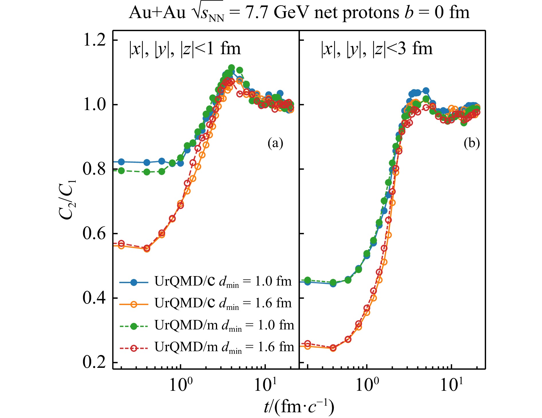 $ C_2^{}/C_1^{} $ 随时间的演化。图4(a)为极端中心区域($ |x|, |y|, |{\textit{z}}|<1 $ fm),图4(b)为稍大的中心区域($ |x|, |y|, |{\textit{z}}|<3 $ fm)。可以看到,$ d_{\min}^{} = 1.0 $ fm模式下的$ C_2^{}/C_1^{} $ 大于$ d_{\min}^{} = 1.6 $ fm模式下的结果,在初始时刻到$ t = 1 $ fm/c期间差异最大,并且二者几乎不发生变化,表明初态密度涨落可以存在到最大压缩阶段。随后$ t \geqslant 1 $ fm/c阶段,随着时间的演化$ d_{\min}^{} $ 对$ C_2^{}/C_1^{} $ 的影响迅速减小,表明初态密度涨落对动力学演化过程及高阶累积矩有影响,但也只限于反应早期。随着反应的进行,平均场势相互作用开始发挥作用,由$ d_{\min}^{} $ 引起的初态密度涨落的信息将被平均场势相互作用的影响湮灭掉。其次,对比(a)、(b)两图可以发现,在更小的中心区域内(图4(a),$ |x|, |y|, |{\textit{z}}|<1 $ fm),可以看到平均场势相互作用对$ C_{2}^{}/C_{1}^{} $ 有着较弱的影响(绿色和蓝色实心圆),并且相较于$ d_{\min}^{} $ 所带来的影响,平均场势相互作用的影响显得极弱。仔细观察图4(b)(即$ |x|, |y|, |{\textit{z}}|<3 $ fm)初始时,UrQMD/m模式下得到的累积矩略大于UrQMD/c模式下的结果,表明在弹靶核刚接触时,会引起内部核子间势相互作用的反应。需要指出的是,这里的平均场势相互作用对高阶累积矩的影响与我们之前的研究结果一致[57-58, 64]。 -