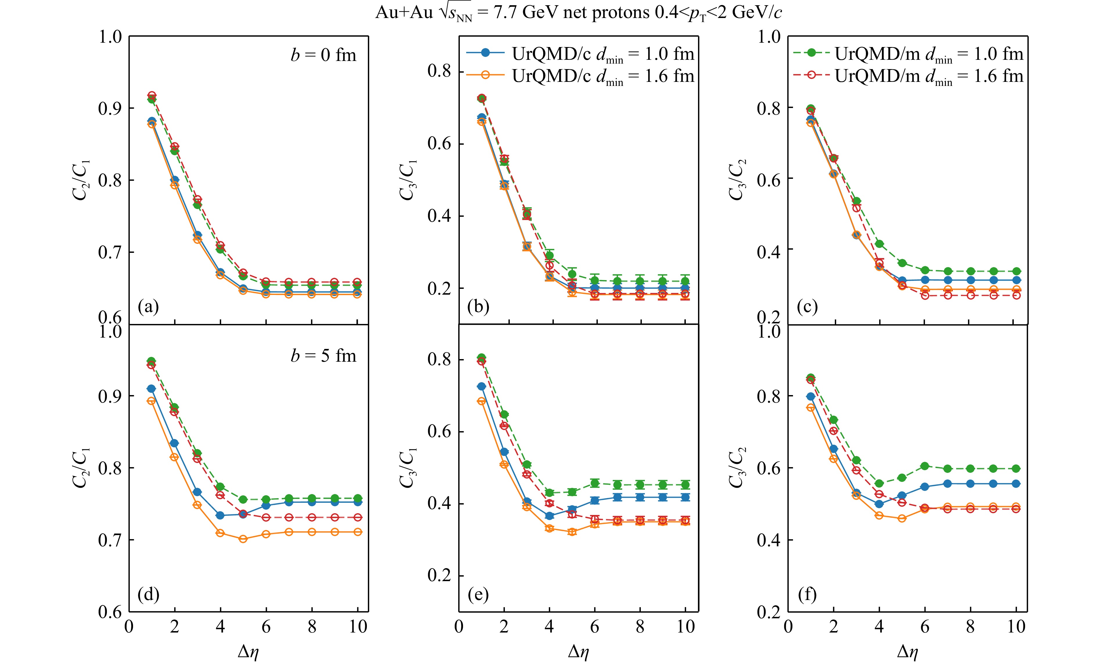 $ \varDelta \eta $ $ \geqslant $ 4时,由于重子数守恒,所有的累积量比值都受到了抑制,同时核平均场相互作用的影响也被压低,而$ d_{\min}^{} $ 的影响逐渐变得明显。对于$ \Delta \eta $ ≥4,使用$ d_{\min}^{} = 1.0 $ fm得到的$ C_2^{}/C_1^{} $ ,$ C_3^{}/C_1^{} $ 和$ C_3^{}/C_2^{} $ 都比使用$ d_{\min}^{} = 1.6 $ fm得到的结果大,而这种$ d_{\min}^{} $ 所引起的累积矩比值的增加,甚至比核平均场势所引起的增加还要大。这是因为具有大赝快度的粒子通常经历了相对较少的碰撞,因此,初始密度涨落的信息可以得到大部分的保留,并最终体现在累积量上。在$ \Delta \eta $ = 4~6的范围内,可以看到$ C_2^{}/C_1^{} $ ,$ C_3^{}/C_1^{} $ 和$ C_3^{}/C_2^{} $ 有轻微的上升趋势,这可能是因为在大赝快度观测窗口下碎片数的涨落导致净质子累积矩的抬升。此外,在较大的碰撞参数下($ b $ = 5 fm),$ d_{\min}^{} $ 和平均场势相互作用对累积矩的影响更为明显。因为初态密度涨落和势相互作用对累积量及其比值的影响可能会由于碰撞而冲刷掉,而$ b $ = 0 fm的中心碰撞下,平均每个重子将会经历更多的碰撞。 -