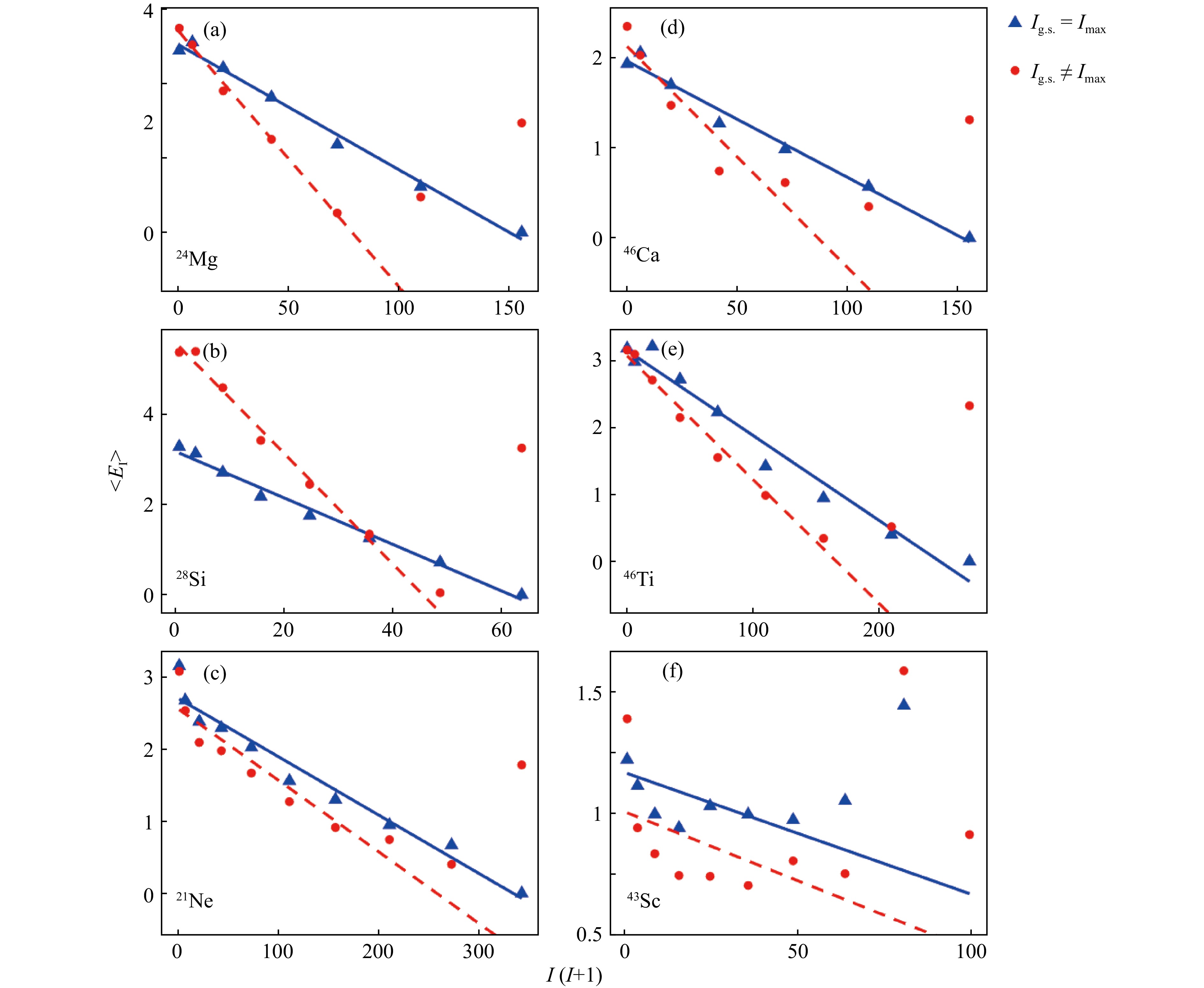 核素 $ C_{1} $ $ C_{2} $ 24Mg 0.993 0.942 28Si 0.977 0.920 46Ca 0.995 0.971 46Ti 0.984 0.965 21Ne 0.975 0.943 43Sc 0.985 0.960 表 3 “逆”非集体转动行为的Pearson相关系数