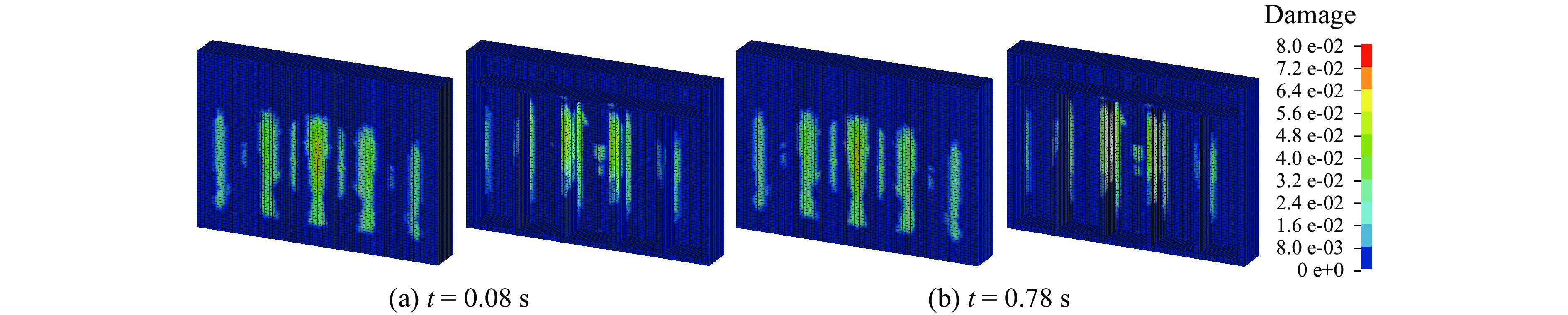 由图12可知,工况3中结构变形和毁伤至t=0.08 s时基本完成,至第1次气泡脉动周期结束,即t=0.78 s后,不再发生变化。工况3的变形与毁伤程度较工况1小,迎爆面侧主要以比例爆深偏下位置为中心,广泛分布于各仓格外墙中垂线附近。毁伤分布范围和程度由中间向两侧仓格减小,沿中间仓格内隔墙对应位置亦有一定毁伤分布。从背爆面来看,中间仓格外墙中心和内隔墙混凝土单元的应变较大,其余位置较小。总的来说,该工况下,结构变形与毁伤在t=0.08 s时基本完成,气泡脉动二次毁伤效应较弱。水下爆炸对结构的毁伤分布较广、毁伤程度较轻,主要分布于外墙迎爆面和中间仓格内隔墙。