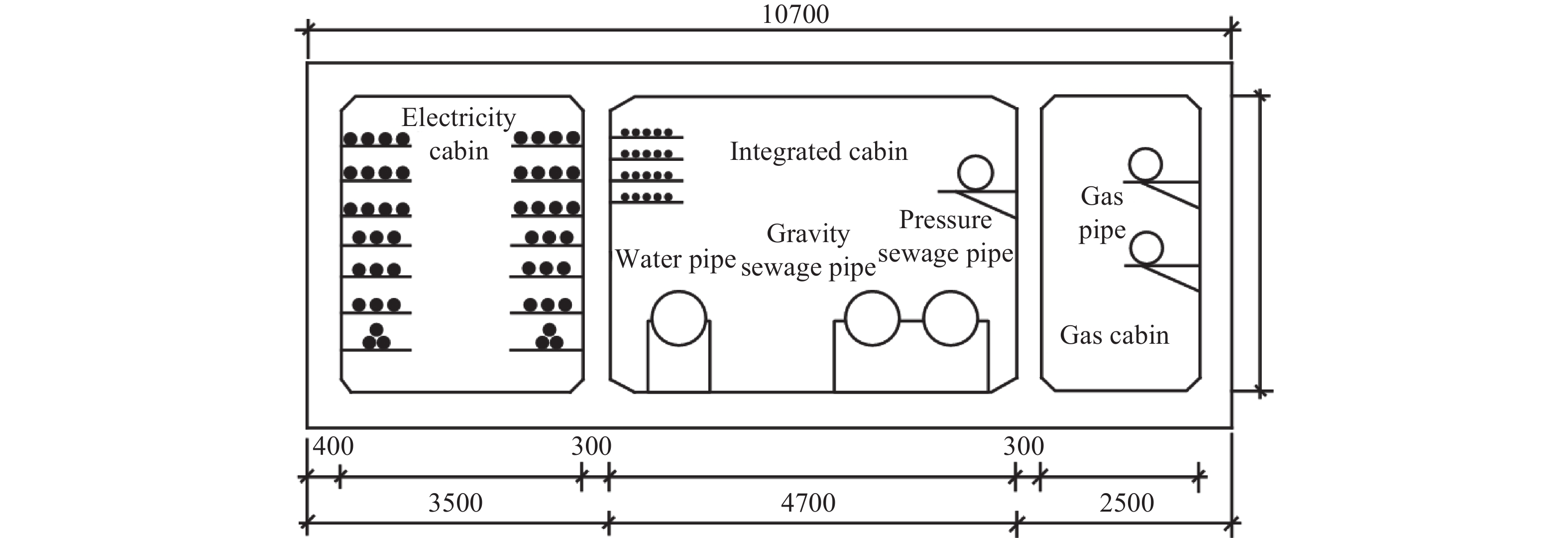 平潭综合试验区中E型综合管廊截面宽度10.7 m,高度为3.5 m,混凝土结构外墙厚0.4 m,内墙厚0.3 m。工程采用暗挖法,土层性质未改变,管廊底部至路面,为3层不同性质的土体,从上往下分别为素填土、全风化花岗岩以及砂土状强风化花岗岩,土壤参数见表1。管廊共有3个仓室,燃气仓由于其特殊性独立成仓,位于管廊最右边,管廊截面见图1。