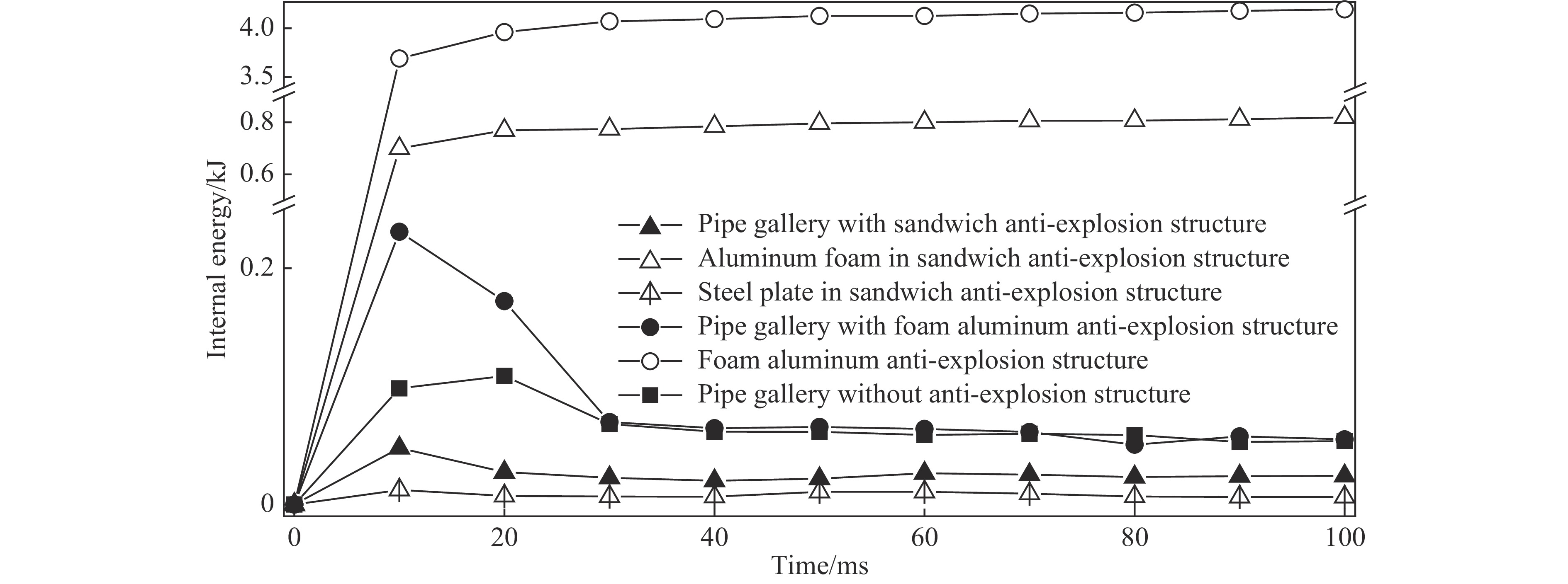 图10为3种工况下结构的内能时程曲线。从图10可以看出,在无任何抗爆结构的管廊内,最初管廊结构内能急剧增加,在20 ms左右内能达到最大值,为0.108 kJ,但随后内能又有所下降,在40 ms之后,趋于稳定,约为0.06 kJ。在存在泡沫铝抗爆结构的管廊内,从爆炸开始到25 ms时间内,泡沫铝吸收大量能量,内能急剧增大,随后内能趋于平稳,为4.1 kJ。地下管廊结构的内能,在25 ms之后也趋于稳定,为0.05 kJ。与无任何抗爆结构的管廊相比,内能减少了约16.7%。在复合抗爆结构的管廊内,从爆炸开始到10 ms,钢板、泡沫铝和管廊结构的内能都增大;但从10~30 ms时间段内,泡沫铝的内能还在增加,而管廊结构和钢板的内能呈减小趋势;随后3种材料结构内能都趋于平稳,泡沫铝内能为0.8 kJ,地下管廊结构内能为0.025 kJ,钢板内能为0.01 kJ。与无任何抗爆结构的管廊相比,内能减少了约58.3%。