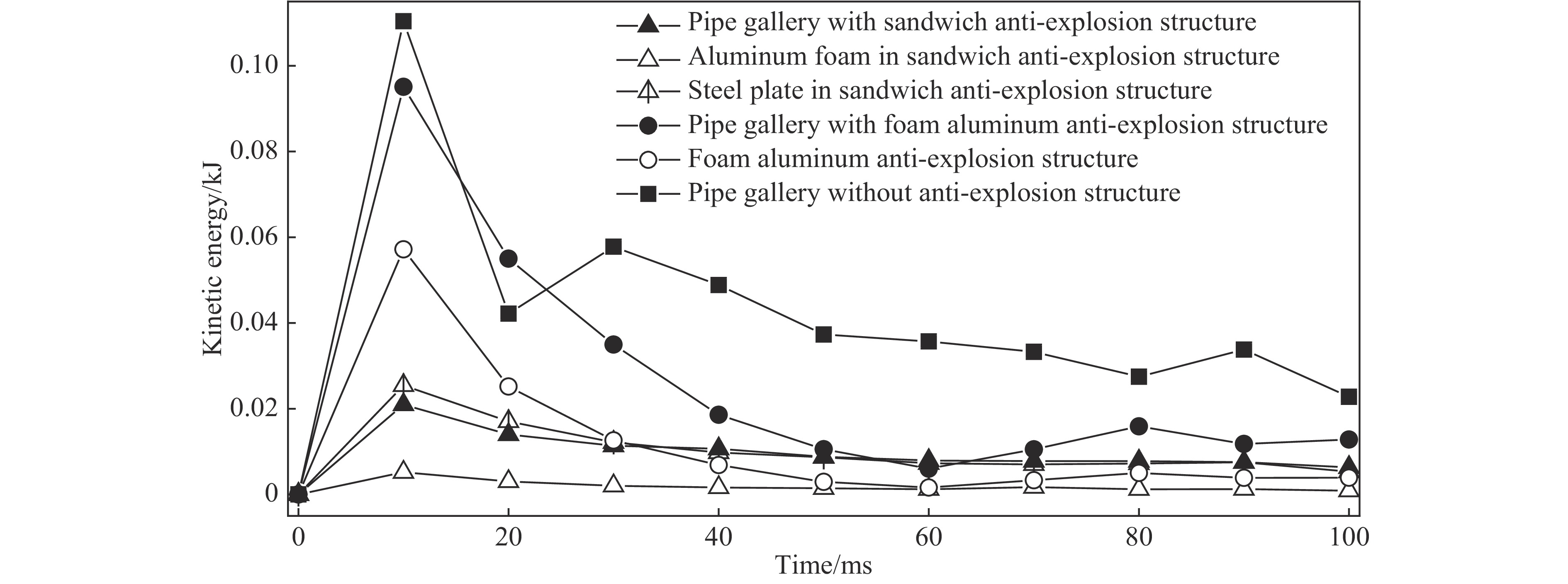 从图11可以看出,无抗爆结构管廊的动能在10 ms时达到最大,为0.11 kJ。在泡沫铝抗爆结构中,泡沫铝结构和管廊结构的动能短时间迅速增加,在10 ms时动能同时达到最大,分别为0.057、0.095 kJ,但管廊的动能峰值与无任何抗爆结构的管廊相比,动能降低了13.6%。在复合抗爆结构中,钢板的动能峰值为0.025 kJ,而泡沫铝的动能峰值仅为0.005 kJ,复合抗爆结构的动能为0.03 kJ,管廊结构的动能峰值为0.021 kJ,与无任何抗爆结构的管廊相比,动能降低了80.9%。