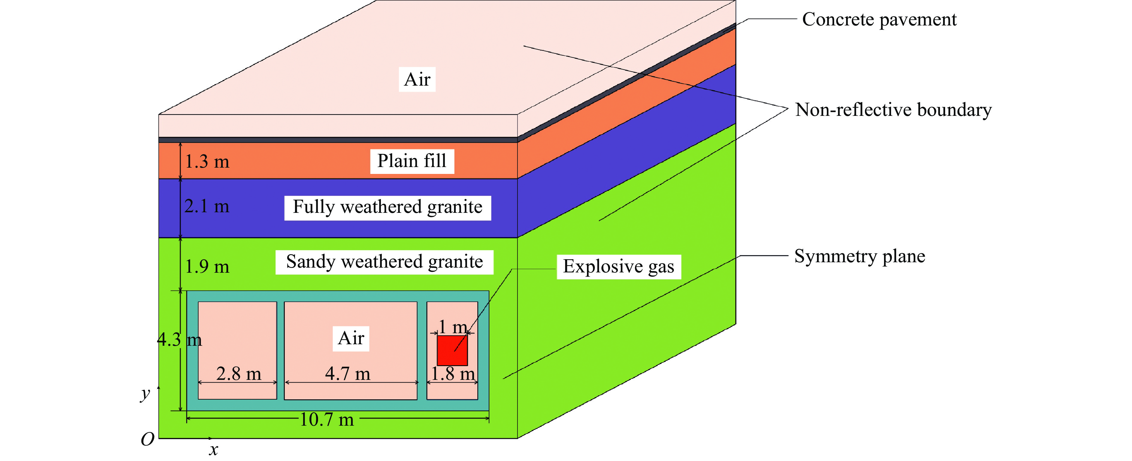 $\mu $ s单位制,在保证合适的计算精度和计算机成本要求下,模拟采用15 cm的控制尺寸划分网格,由于混凝土结构为主要的受力构件,且容易产生应力集中,为进行有效合理的模拟,对网格进行加密。共有3种计算模型以模拟不同的工况:一是未添加任何减振层结构的计算模型,二是在燃气仓周围只添加20 cm厚度的泡沫铝减振层,三是在燃气仓周围添加“钢板-泡沫铝-钢板”复合结构。钢板厚度和泡沫铝厚度分别为5 cm和10 cm。图3为添加抗爆层的有限元模型燃气仓xOy截面。有限元模型采用Solid164实体单元建模,混凝土结构、钢板以及泡沫铝结构用Lagrange算法,爆炸混合气体、土体、空气采用Euler网格,Euler网格包含Lagrange网格,单元使用多物质ALE算法,利用CONSTRAINED_LAGRANGE_IN_SOLID方式进行流固耦合计算[19]。