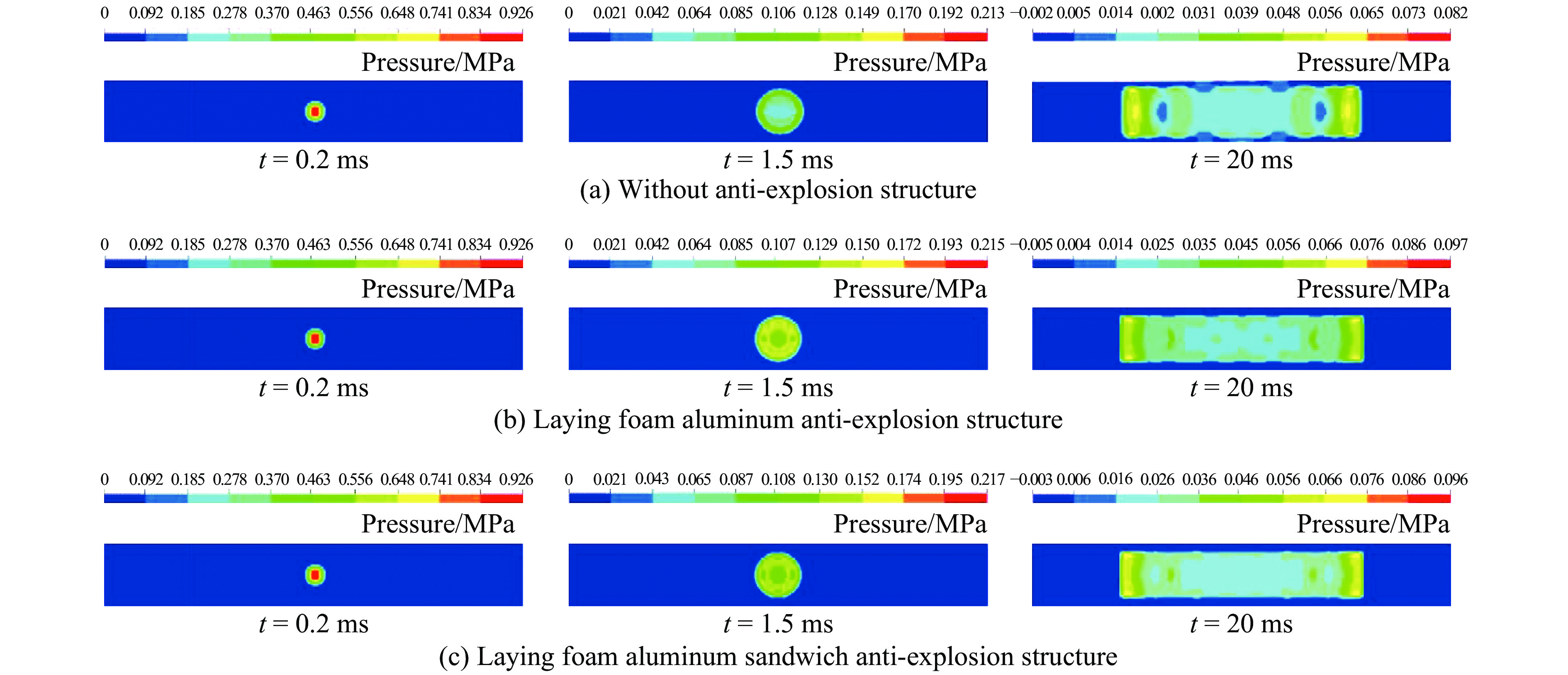 图5为爆炸冲击波在管廊燃气仓径向传播的压力云图,以研究抗爆材料敷设对冲击波传播规律的影响。从图5可以看出,3种工况的冲击波传播规律大致相同。在爆炸初始阶段,爆源中心压力最大,向外逐渐减小。在t=1.5 ms时,爆炸产物以极高的速度向周围扩散,压力峰值从中心向周围转移,形成初始冲击波,且在转移过程中压力峰值逐渐降低。随着冲击波向前传播,压力降至周围气体压力为扰动时的初始压力,但爆炸产物由于惯性作用继续向前传播,此时爆炸产物的平均压力低于介质未经扰动时的初始压力,从而出现负压区。由图5可以看出,在t=20 ms时,波阵面内部压力小于波阵面,在内部形成负压区。冲击波在传播过程中燃气仓内部产生正负压变化,导致结构首先受到高强压力,随后由于负压而受到较大的吸力,从而结构受到的外力方向发生改变,管廊结构容易发生破坏。