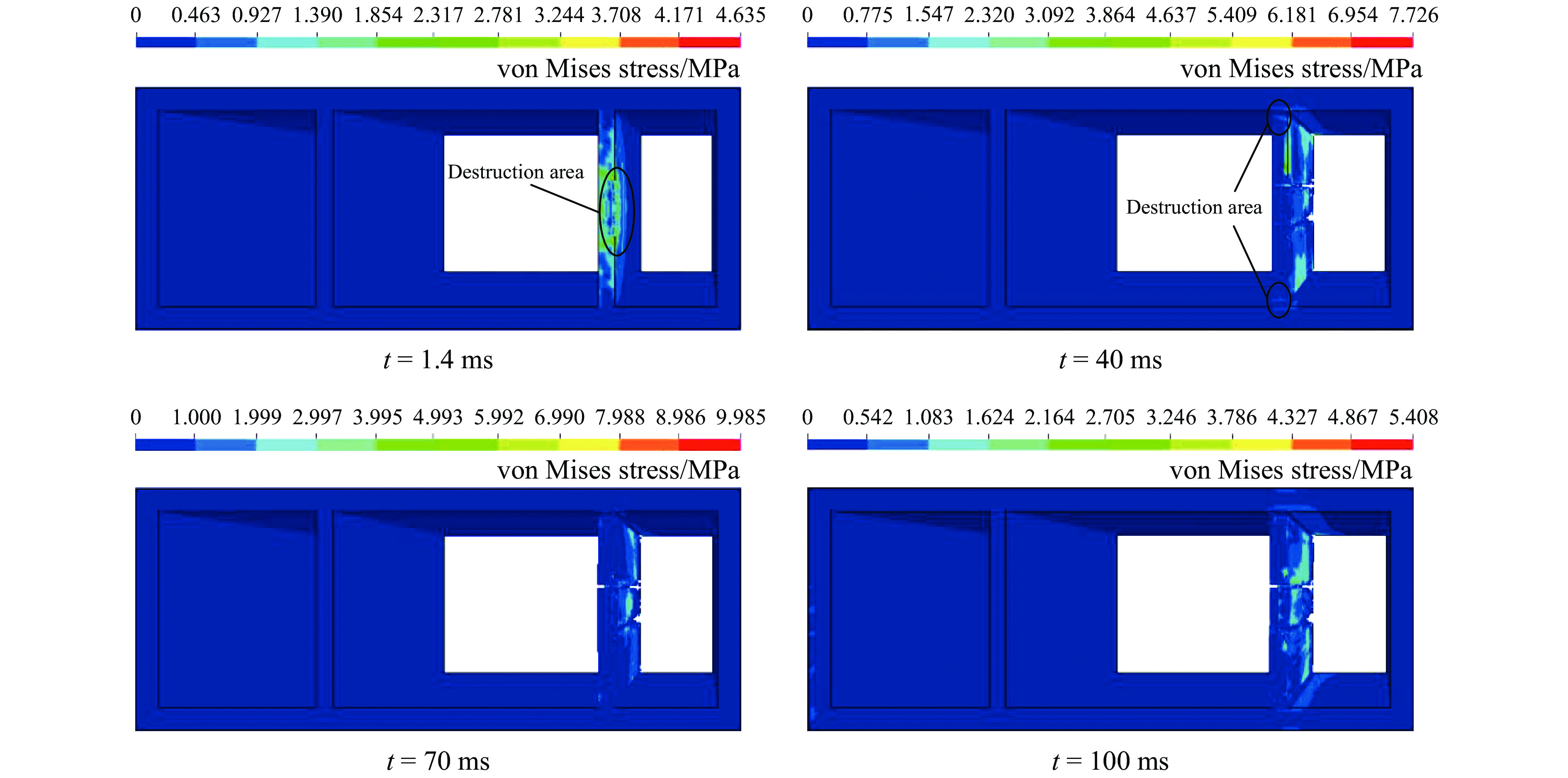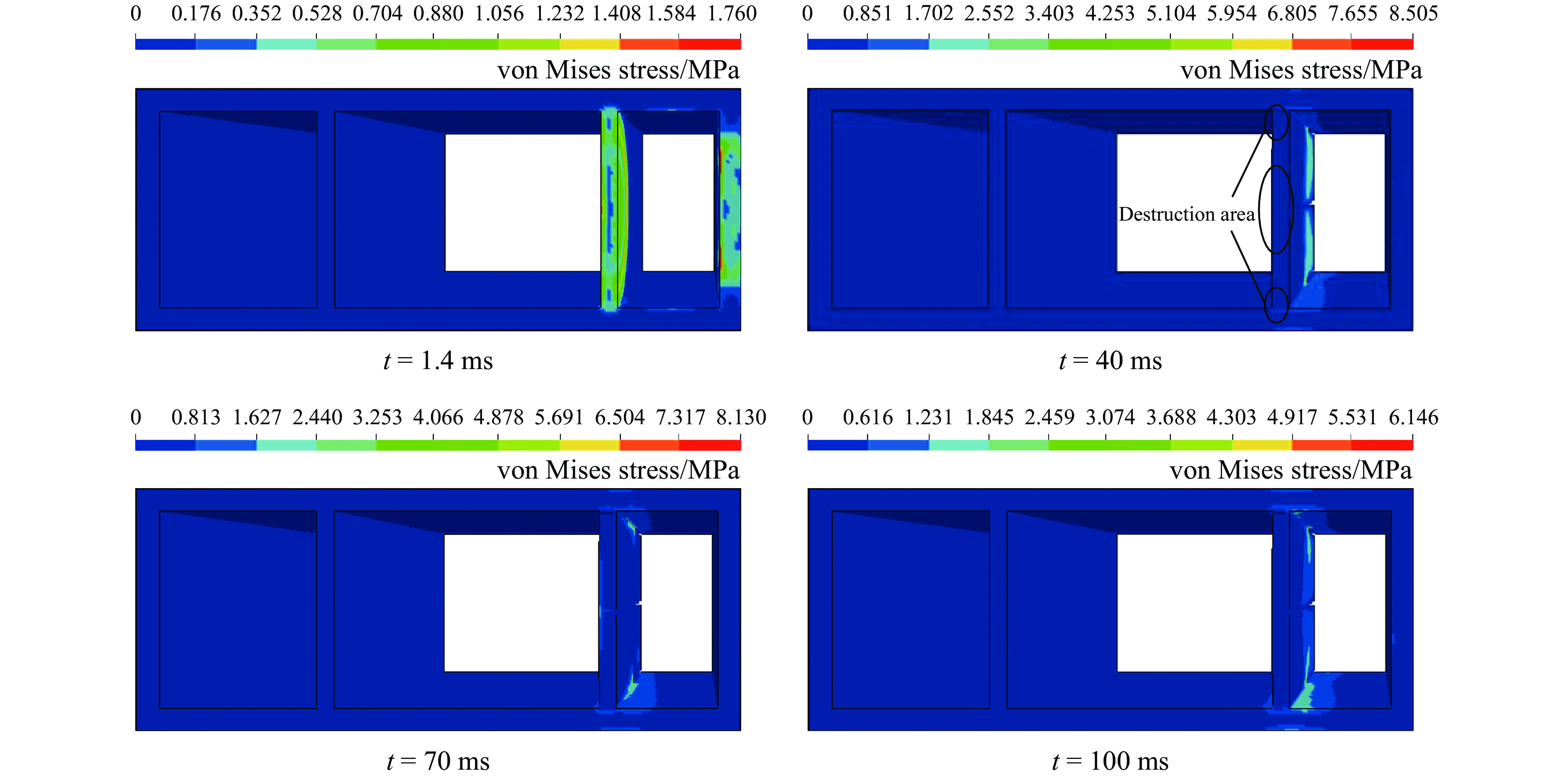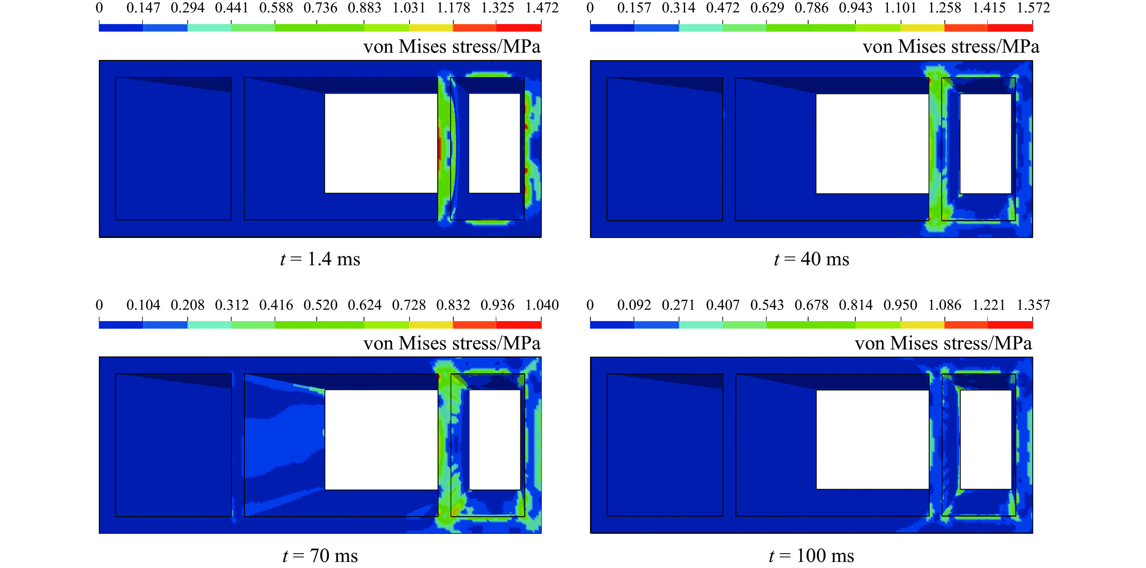 图6为无任何抗爆结构管廊的应力云图。从图6可以看出:在t=1.4 ms时,管廊燃气仓内墙混凝土结构产生较大的应力,且内墙结构发生破坏;在t=40 ms时,管廊燃气仓内墙与外墙连接处发生破坏,这是由于内墙与外墙连接处的结构形状有急剧变化,产生应力集中,使物体出现疲劳裂纹。随着爆炸的不断发生,燃气仓混凝土结构的应力逐渐降低。图7为敷设泡沫铝抗爆结构管廊的应力云图。从图7可以看出:在t=40 ms时,燃气仓左右两侧混凝土结构有较大应力,与无抗爆结构的管廊相比,此时峰值应力降低了约62%;在t=1.4 ms时,管廊内墙与外墙连接处出现破坏;在t=100 ms时,具有泡沫铝抗爆结构的管廊整体破坏与无抗爆结构的管廊相比,大大降低。图8为敷设泡沫铝夹芯抗爆结构管廊的应力云图。从图8可以看出:与其他两种工况相比,敷设泡沫铝夹芯抗爆结构的管廊燃气仓周围混凝土结构的应力较小,且分布较为均匀,管廊结构未出现明显破坏。