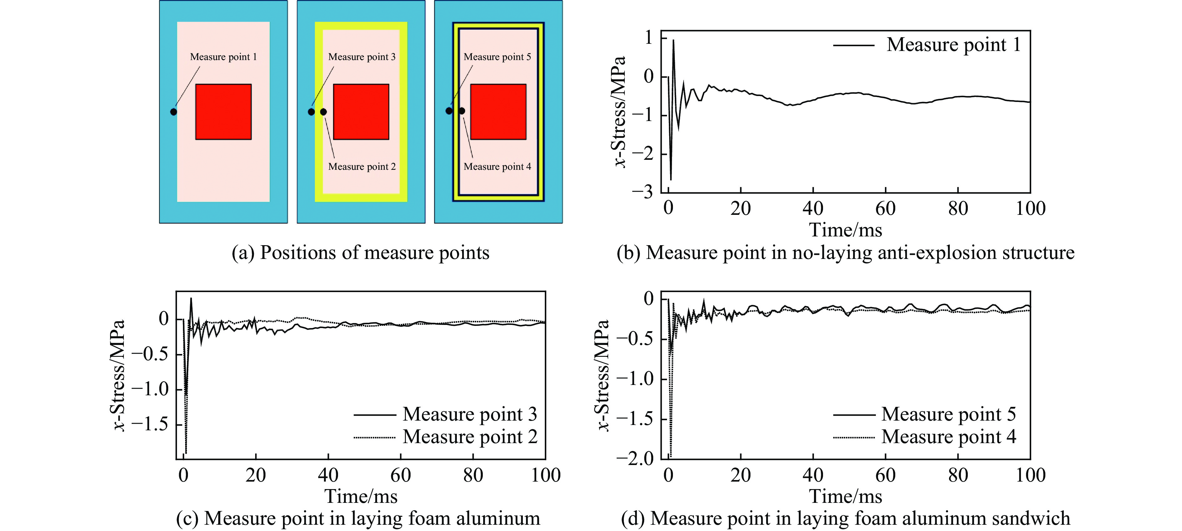 在管廊燃气仓内墙以及抗爆层距离爆源最近位置选取测点,监测测点应力变化,研究爆炸荷载通过抗爆结构作用在管廊结构的过程中应力衰减情况以及衰减规律,测点位置如图9(a)所示。图9(b)~图9(d)为测点x方向的应力时程曲线,应力方向与所建模型坐标轴方向一致。由图9(b)可知,在没有抗爆结构的管廊内,测点应力经历了两次峰值,第一次应力峰值为2.67 MPa,随后在t=2.8 ms时,达到第二次应力峰值1.28 MPa。两次应力峰值方向也发生变化,这是由于冲击波在传播过程中燃气仓内部发生正负压变化,从而导致结构应力方向发生变化。在0~10 ms这段时间内,应力值发生了明显的变化;10 ms之后,应力逐渐趋于稳定。