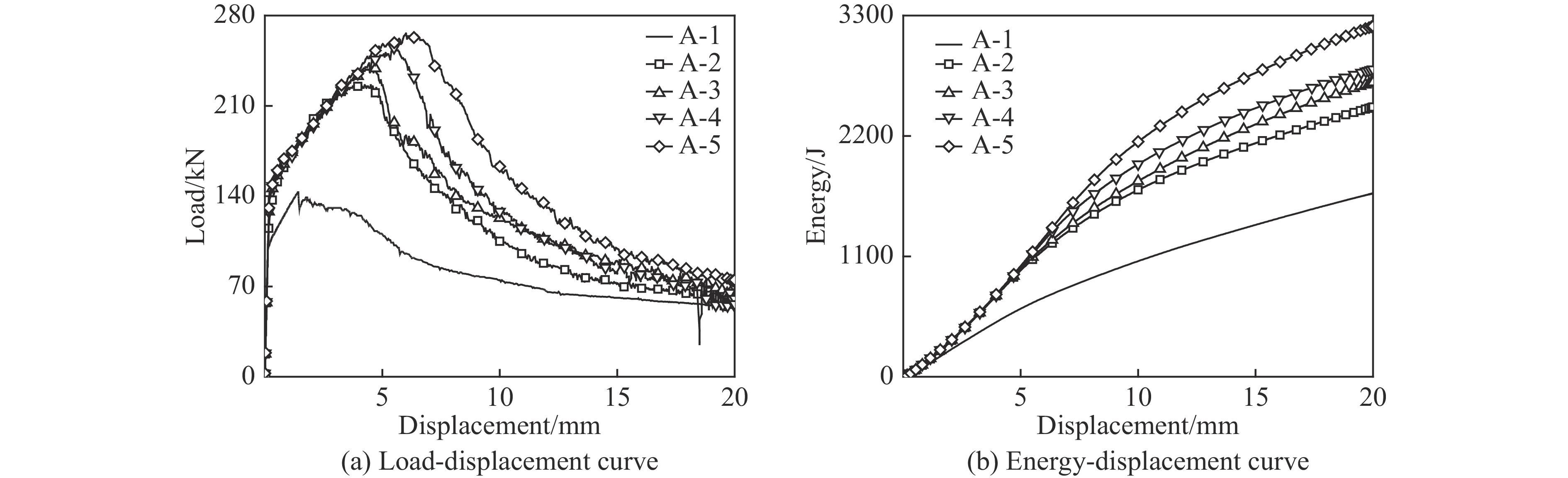 为进一步讨论低速冲击范围内,应变率效应对GFRP增强圆钢管试件性能的影响,针对恒定速率加载过程开展了一系列有限元模拟研究,试件设计参数及加载工况如表8所示。对比试件A-1~试件A-5的仿真结果(图13)可以得到如下结论:(1)试件在准静态及动态轴压荷载作用下具有相似的荷载-位移曲线形式,说明材料应变率效应对试件破坏模式的影响不大;(2)除准静态过程外,其余试件的荷载上升段随加载速率的增大变化不大,但峰值荷载明显增大,说明材料应变率效应与试件极限强度有正相关的关系,但对试件刚度影响不大;(3)随着加载速率增大,试件的耗能能力明显增大。此外,通过不同的钢管及GFRP壁厚试件结果的对比(图14)可知,在低速冲击范围内,钢管壁厚较大试件的峰值荷载及耗能能力随着加载速率增大具有更明显的增大效果,表明相对GFRP而言,钢管的应变率效应更为明显。