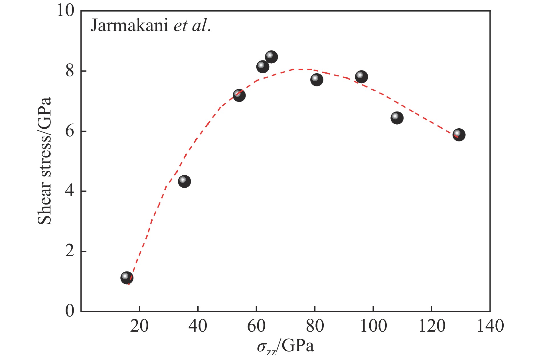 加载应力的变化除了影响应变率以外,还会导致变形机制发生变化。Cao等[41]采用不同加载压力对冲击加载下铜的微结构演化行为进行了研究,实验发现:当采用5 GPa的加载压力时,材料中会出现大量的位错网络;当采用30 GPa的加载压力时,材料中会出现大量的滑移带和堆垛层错;当采用50 GPa的加载压力时,材料内部会出现更多、更复杂的微结构,如孪晶、位错网络、变形带以及滑移带等。Jarmakani等[42]通过分子动力学方法模拟了不同冲击压力下金属Ni中塑性变形机制的转变,得到了各种机制之间的转变阈值压力,并将较高压力下剪切强度随应力衰减的行为归因于位错成核,如图1所示。
