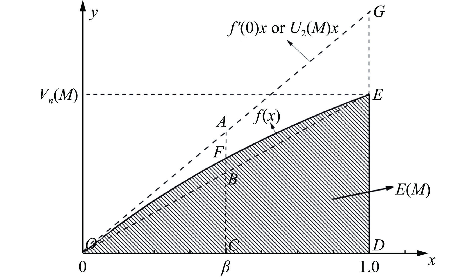 $\beta $ 的新势函数,来自两部分贡献:第1部分是由从头算方法计算得到的两体势${\beta ^2}{U_2}\left( M \right)$ ,对应着图1中的${\text{△}}OGD$ 的面积;第2部分是通过求解薛定谔方程得到的总多体势$\left( {1 - {\beta ^2}} \right){V_n}\left( M \right)$ ,对应着图1中的${\text{△}}OED$ 的面积。由图1和(19)式可以得到:若