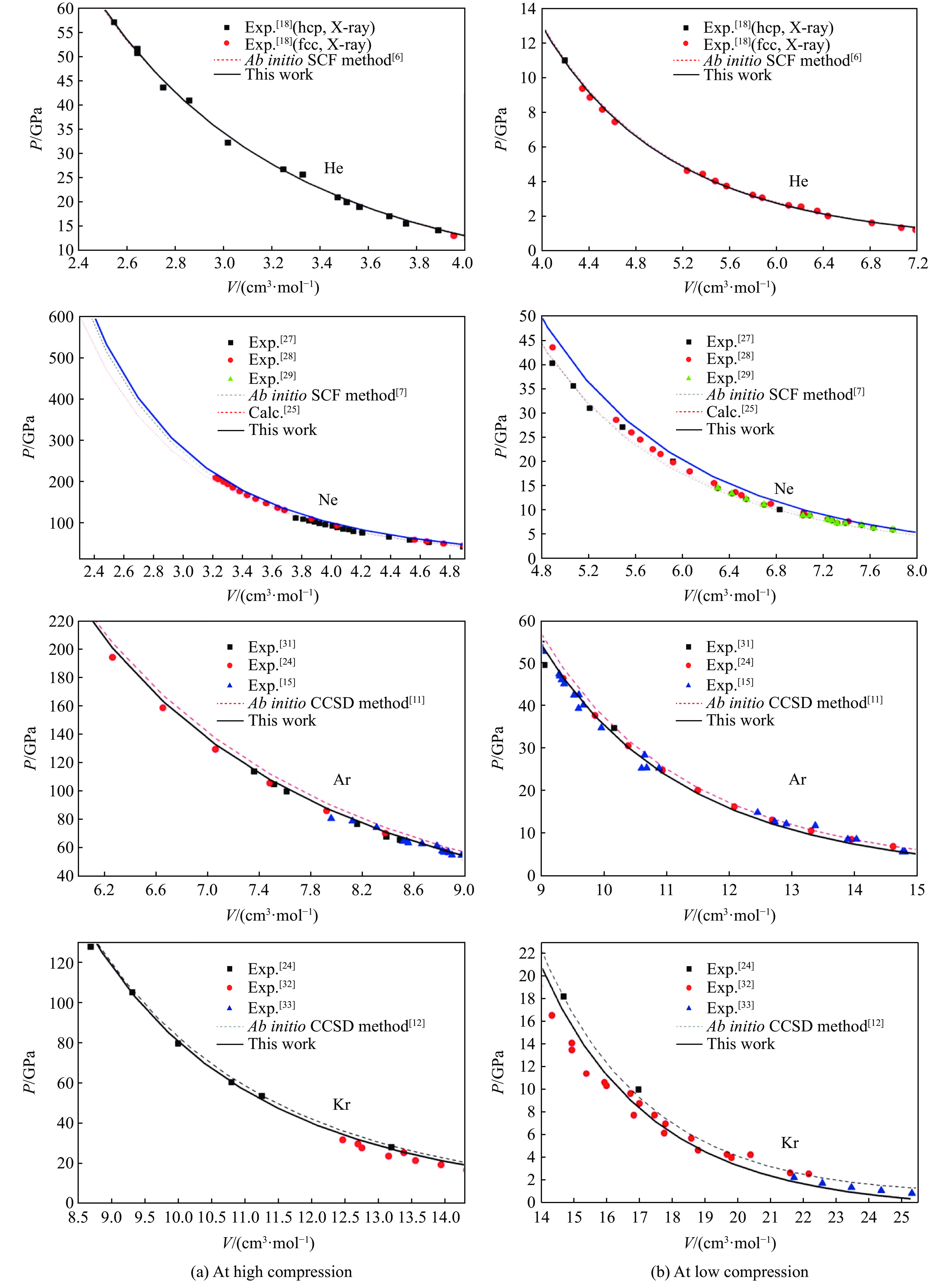 $\beta $ (其值为0.5),使得结合能的经验表达式更加简单、准确。比较结果表明:结合能的新经验势函数能够准确地描述多体相互作用对结合能的贡献,且相对误差在5%以内,能够更广泛地应用到基于RHF理论的分子体系密度范围之内,对原子晶体的结构转变、相变、弹性系数和高压熔化线的理解具有特殊的价值;运用新经验势的理论计算方法,可以将一些简单的理论、表达式很容易地扩展到原子多体展开理论或分子势理论;此外,此表达式和方案做法有望应用于一些离子体系和分子体系的短程排斥势情况。在高压区域,结合能的新势函数对高压压缩特性的影响在当前实验范围内(氦1~60 GPa,氖1~238 GPa,氩1~114 GPa,氪1~128 GPa)做出了令人满意的描述,数值结果与实验结果、理论计算结果基本吻合,平均相对误差在3%以内。最后,以固氩的压强数据为例,验证了该势函数的准确性。该经验势函数不仅适用于更宽的密度和压强范围,而且对所有惰性元素原子的各种状态的高压压缩特性研究具有重要的指导意义。