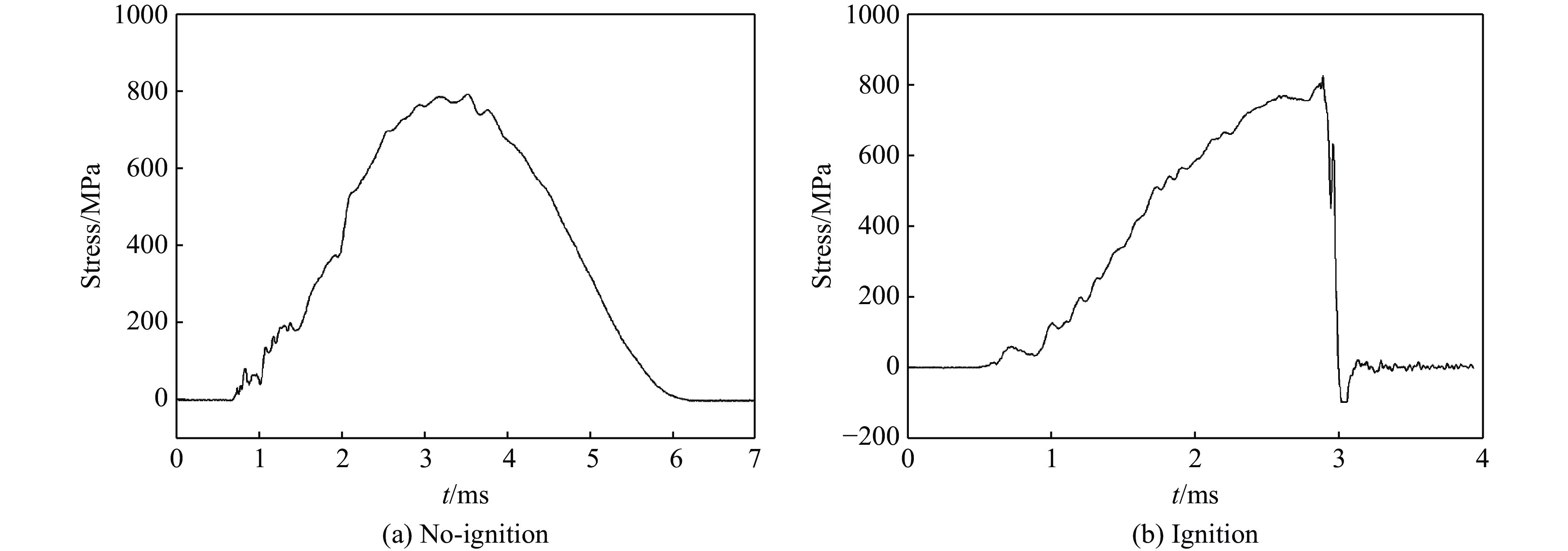 • 通过对试样1进行落锤加载试验,得到其发生爆炸时的临界落高为2.2 m,相同工况下,B炸药的临界落高为1.75 m[12]。试样1的典型加载曲线如图3所示,其中图3(a)为未发生爆炸反应的加载曲线,图3(b)为发生爆炸反应的加载曲线。