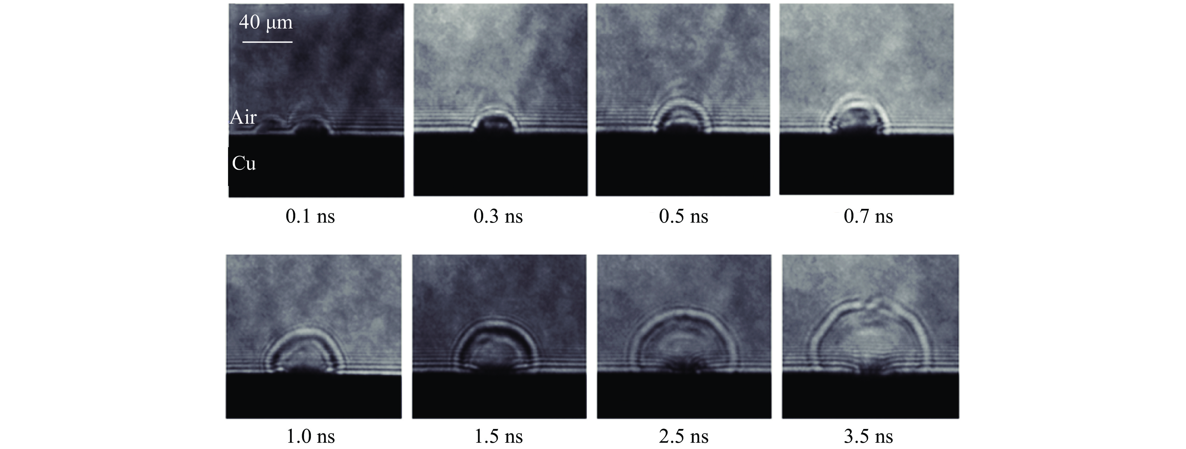 与飞秒激光烧蚀金属铝的实验条件相同,将铝样品更换为铜样品,观察铜靶烧蚀的冲击波,结果如图3所示。烧蚀前两阶段的现象与铝一致:在烧蚀的初始阶段(0~0.3 ns),在铜表面观察到半圆形黑色稠密等离子团;时间延迟0.5~1.5 ns阶段,同样包含半圆形冲击波的膨胀与表面附近的等离子体扩散。不同的是在2.5 ns以后,金属铜表面几乎观测不到碎屑飞溅,所以也未观测到二次冲击波的产生。