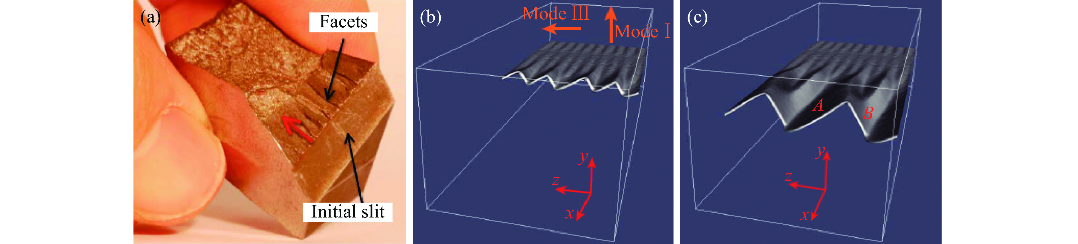 Figure 1.  Experimental result (a) and phase field simulation (b), (c) of jag fracture under mixed condition of type I & III[21]
