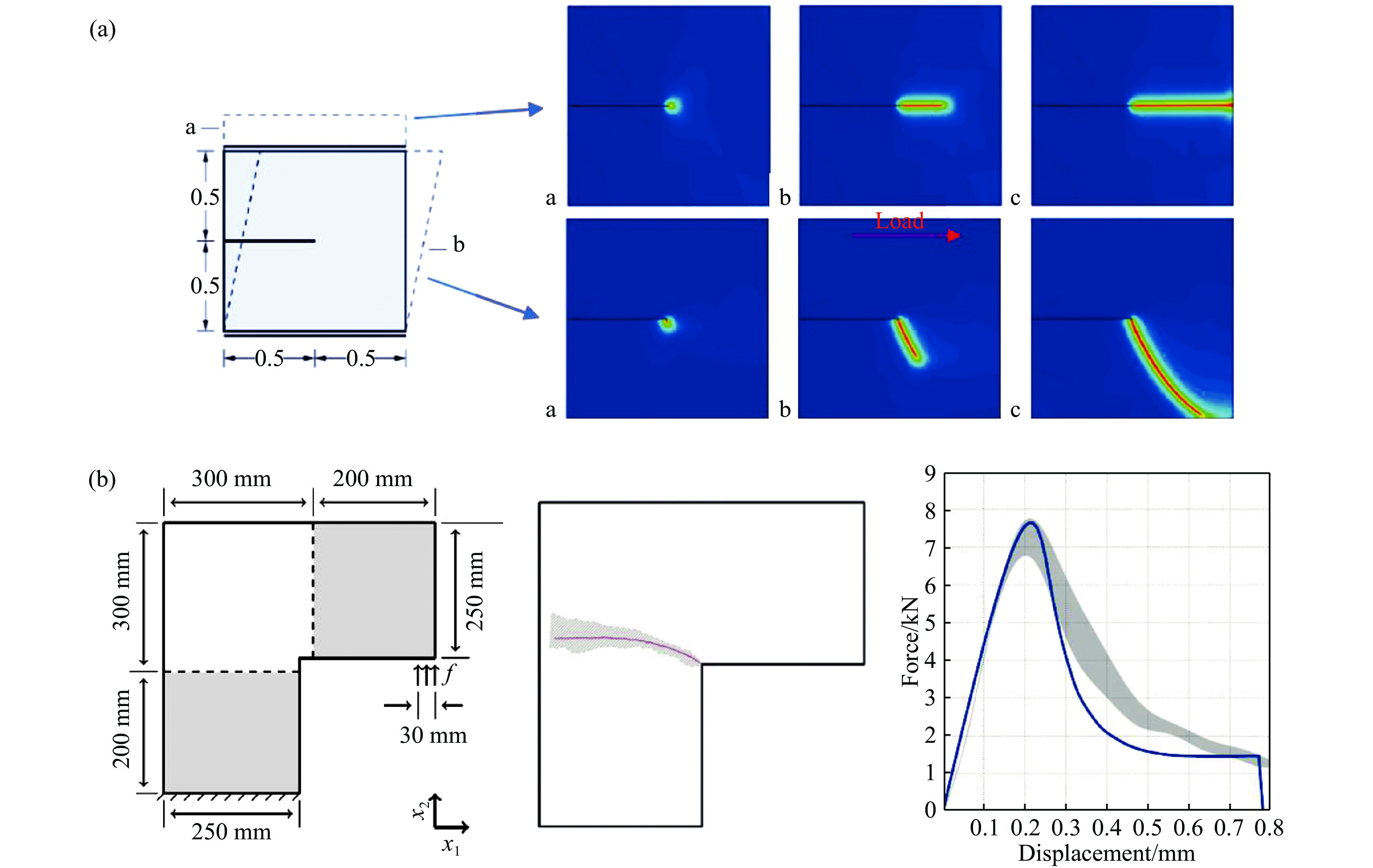 静态模型方面,Miehe成功模拟了I、II型裂纹在不同加载强度下裂纹的扩展长度和发展方向,结果如图2(a)所示。此外,在准确性方面:Miehe等[27]给出了带有预置裂纹的非对称三点弯曲裂纹扩展模拟与实验对比结果;Mesgarnejad等[29]对脆性断裂模型通过多种实验分别进行了定性和定量的对比,图2(b)为L形薄板弯曲时的裂纹扩展结果与实验的定性对比以及载荷-位移曲线的定量对比结果。