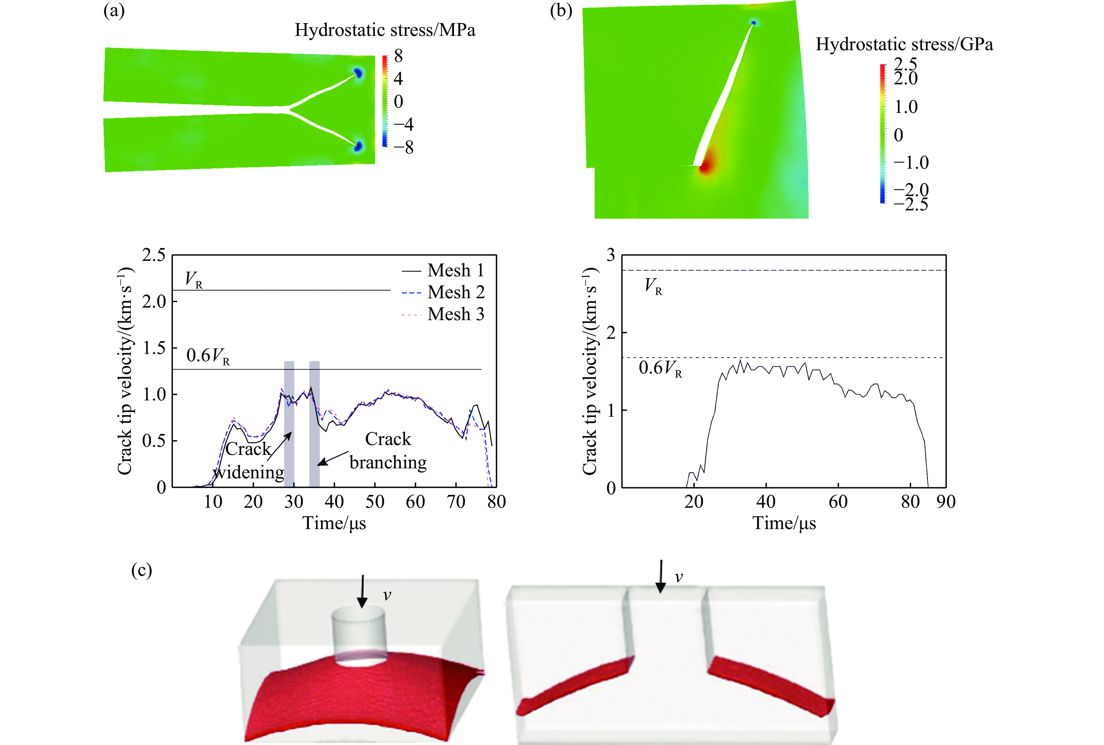 图 3  动态脆性断裂的相场模拟:(a)(b)动态裂纹经典问题[12],(c)三维形式的KW试验模拟结果[32]