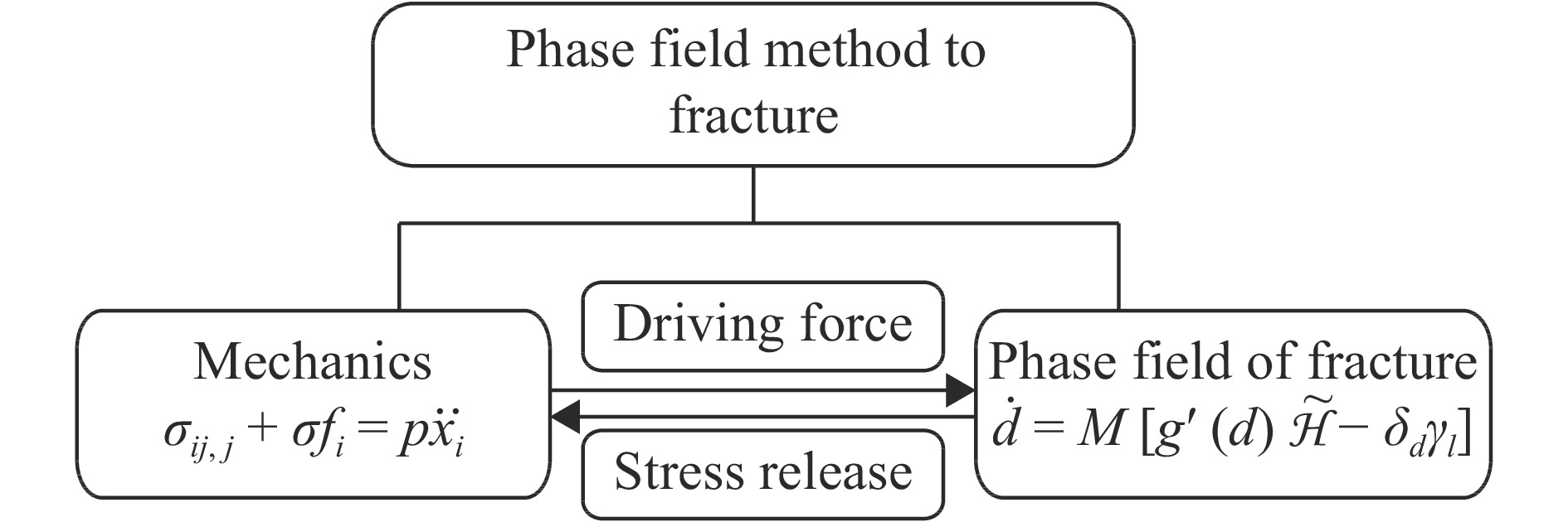 • 目前,相场断裂的发展方向在于解决多场问题。相场断裂方法的基本框架如图4所示。从中可以看出,相场断裂方法由力学平衡方程和相场控制方程构成,基于该框架,两组方程可分别解耦求解,再通过驱动力模型和应力释放本构进行耦合。Miehe等[19, 3536]相继发表了3篇论文用相场断裂方法解决多场耦合问题。首先,其对脆性断裂相场方法进行了总结,给出了如下脆性断裂相场方程