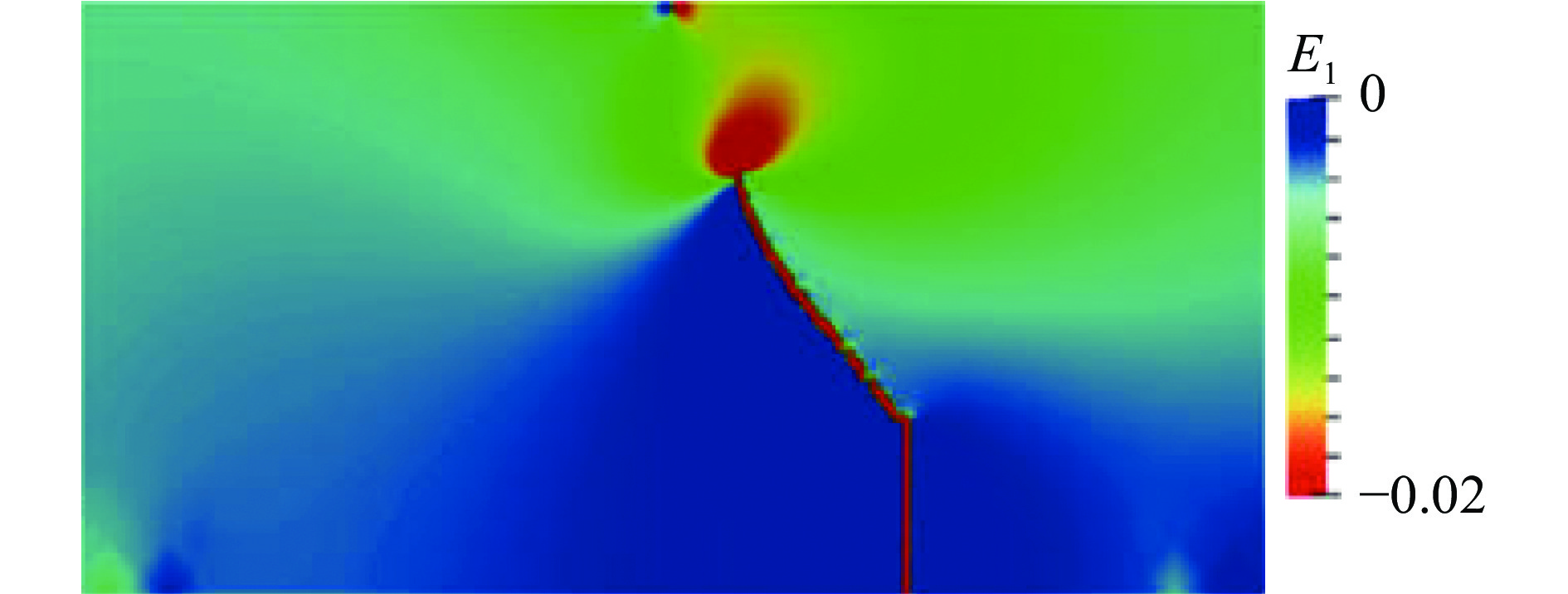 式中:$\phi $为序参量;$g\left( \phi \right)$为插值函数,文中$g\left( \phi \right) = {\phi ^{2 + \alpha }}$,当$\phi $趋近于零时,$\alpha $取正值保证应力完全释放;${\psi _0}$为应变能密度;${\psi _{\rm{c}}}$为临界应变能密度,当应变能密度超过${\psi _{\rm{c}}}$时,裂纹开始起裂扩展;$V\left( \phi \right) = {{{\phi ^2}\left( {1 - {\phi ^2}} \right)} / 4}$,是典型的双势阱函数,势阱位置为0和1。(1)式中前两项称为体自由能项,第一项类似相场方法中的熔化温度项,通过其调整双势阱函数的稳态与亚稳态;最后一项为表面项。该模型完全可与相场方法最初的应用—熔化固化相变的相场方法类比,体现的是相场方法的思想,但自由能中各项的物理意义并不清晰。Pons和Karma[21]于2010年成功模拟了I、III型混合模式产生的锯齿状裂纹,如图1所示,标志着物理领域相场断裂模型的成功。
