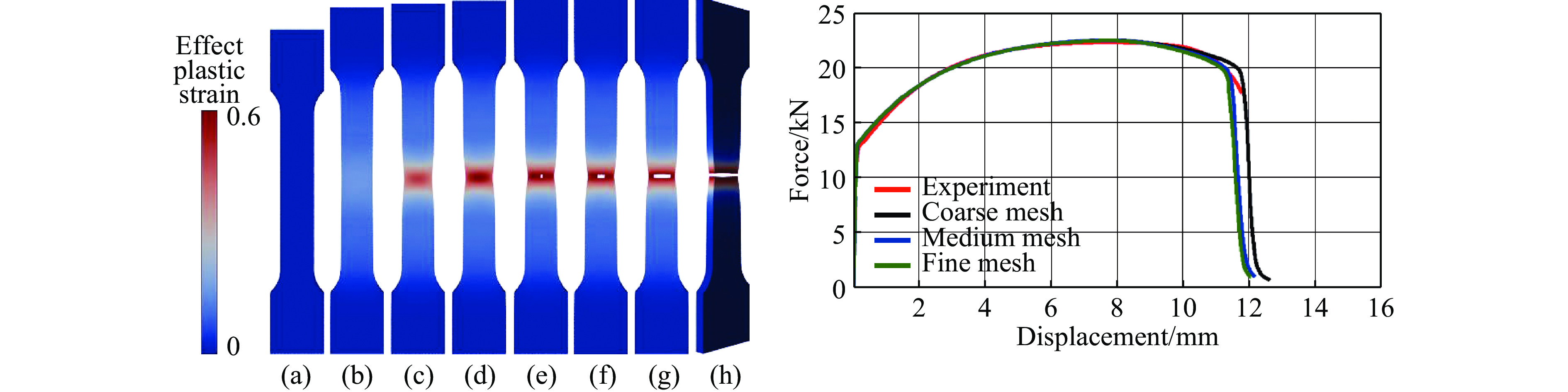 式中:${W_{\rm elas}}$${W_{\rm plas}}$${W_{\rm frac}}$分别表示弹性能、塑性能和断裂表面能。注意其插值函数$g\left( d \right)$只作用于弹性能,表明只有弹性能驱动裂纹扩展,而塑性能作为耗散项不驱动裂纹扩展。对(19)式求变分后会发现相场控制方程和脆性断裂相同,所以该模型只能称为考虑塑性变形的脆性断裂模型。其后,Ambati等[43]在Duda模型的基础上,在插值函数中引入了“等效塑性变形参数”来考虑塑性应变的累积和局部效应。该模型将脆性断裂插值函数$g\left( s \right) = {s^2} + \eta $修改为$g\left( s \right) = {s^{2p}} + \eta $,式中等效塑性变形参数p表示为$p = {{\varepsilon _{{\rm{eq}}}^{\rm{p}}} / {\varepsilon _{{\rm{eq}}{\rm{, \,crit}}}^{\rm{p}}}}$,从而实现了延性断裂的相场模拟。随后,Ambati等[44]将该模型扩展至三维,并通过大量与实验对比的模拟结果来验证其模型的准确性。他们模拟了I型、材料为钢的平板在拉伸时随边界位移载荷增大发生的弹性-塑性变形、紧缩变形、断裂的整个过程,如图8所示,同时还给出了大量与实验结果对比的力-位移曲线,定量表征其模拟的准确性。但Ambati的模型仅为静态模型,且等效塑性变形参数的引入较为经验,同时在用有限元求解时,对于p很大的高阶项,会引起较大的离散误差。