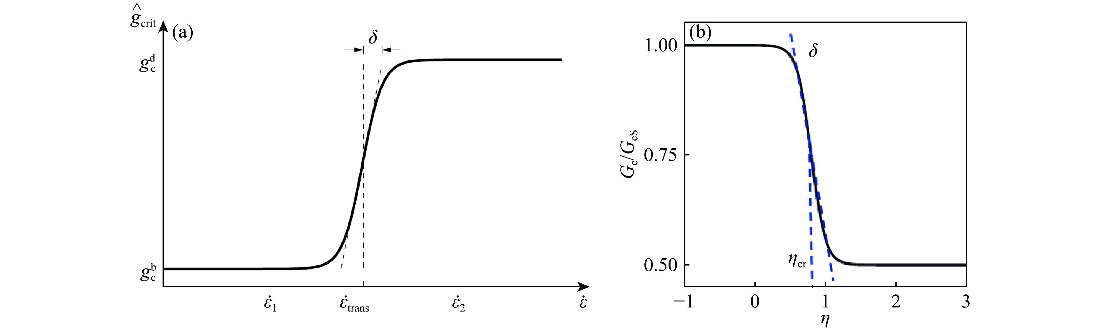 图 9  脆性-延性断裂模型的能量释放率:(a)应变率决定的临界能量释放率转变[36],(b)应力三轴度决定的临界能量释放率转变[46]