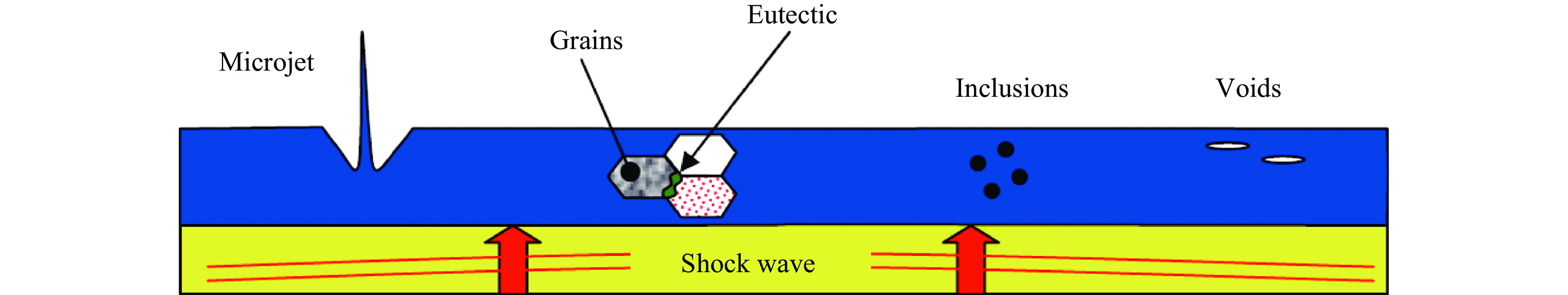 本文所述的微喷射是指冲击波从金属等材料表面反射时产生的物质喷射。据报道,这一现象最早由Walsh等[1]在实验中发现。一般情况下,喷射物的质量很小, 主要来源于(近)表面微米及亚微米尺度缺陷[2–4],因此这种物质喷射常被简称为微喷射。由于其在冲击压缩科学与技术领域中的重要性[5–6],微喷射现象自被发现以来便受到国内外研究学者的广泛关注与重视。早期的微喷射研究以实验手段为主[7–28],多年来微喷射实验技术已取得长足进展,发展了Asay膜[2, 14]、压电探针[15–16]、X射线成像[17–18]、全息成像[19–20]、高速摄影[21]、质子照相[22–23]、光子多普勒测速[24–25]以及回收[26–28]等诸多测试技术。大量实验研究[9, 11]表明,微喷射是一种典型的多机制、多影响因素的复杂动力学现象,图1和图2分别给出了喷射物形成机制示意图与实验观测结果。需要说明,金属表面喷射物质量一般在每平方厘米100 mg以内,喷射颗粒直径大多在10 μm以内,而最大喷射速度可达每秒数公里,这些现象特征为微喷射的精细测量带来极大困难。如何获得更直接、更精确的喷射数据仍然是当前实验研究领域的热点问题。