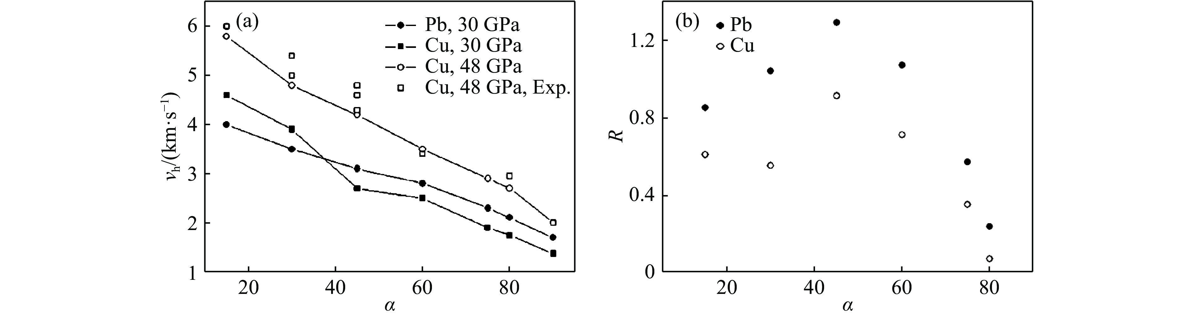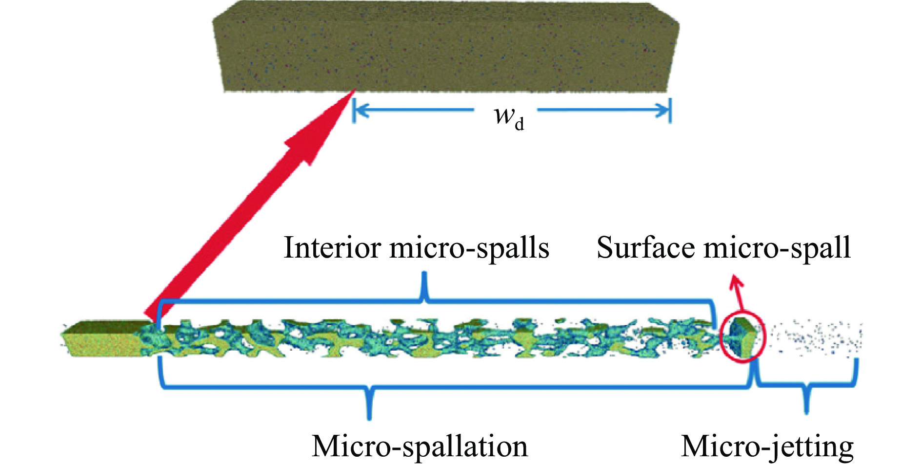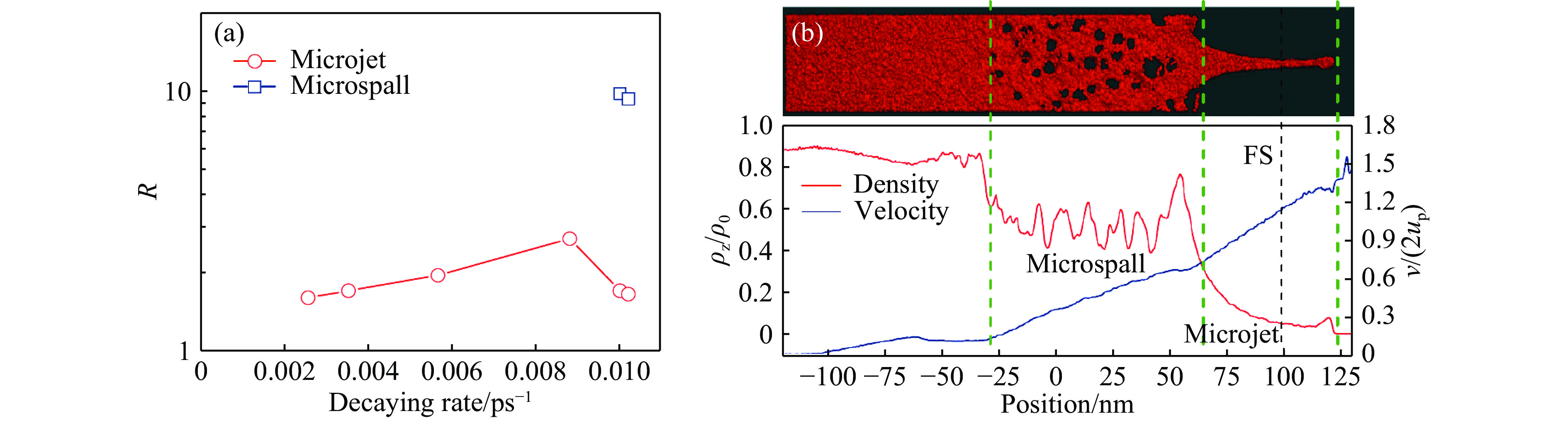 $\sigma _{{\rm{ej}}}^{\max }$ 为强度介质最大喷射质量,$\alpha $ 取为0 ~1之间小数,${\rho _{\rm{0}}}$ 为材料初始密度,$\eta _{\rm{b}}^{{\rm{max}}}$ 为气泡饱和振幅,${\eta _{\rm{0}}}$ 为初始扰动振幅,k为初始扰动波数,Y为材料的等效屈服强度。综合上述强度介质和纯流体微喷射模型,可以给出平面冲击下宽压力区间的喷射总量和最大速度的一般描述。然而对于更复杂的加载条件,则必须考虑实际波形等因素。对于爆轰、激光等加载波形条件,借助经验模型或判据条件,已进行部分数值模拟分析[71–73]。其中,张凤国等[74]基于应力波传播理论,采用应力瞬时断裂判据和损伤累积判据,分析了简单三角波强加载下延性金属的多次层裂破坏问题,给出了层裂片厚度对冲击波宽度与强度的比值的变化,在强冲击加载条件下,破坏深度约为冲击波宽度的一半。最近,邵建立等[53]基于MD模拟分析了不同衰减冲击波下金属铅的破坏形态和深度变化,结合模拟得到的样品内部拉应力和密度变化,给出了表面层裂片厚度和样品破坏深度的近似公式,即