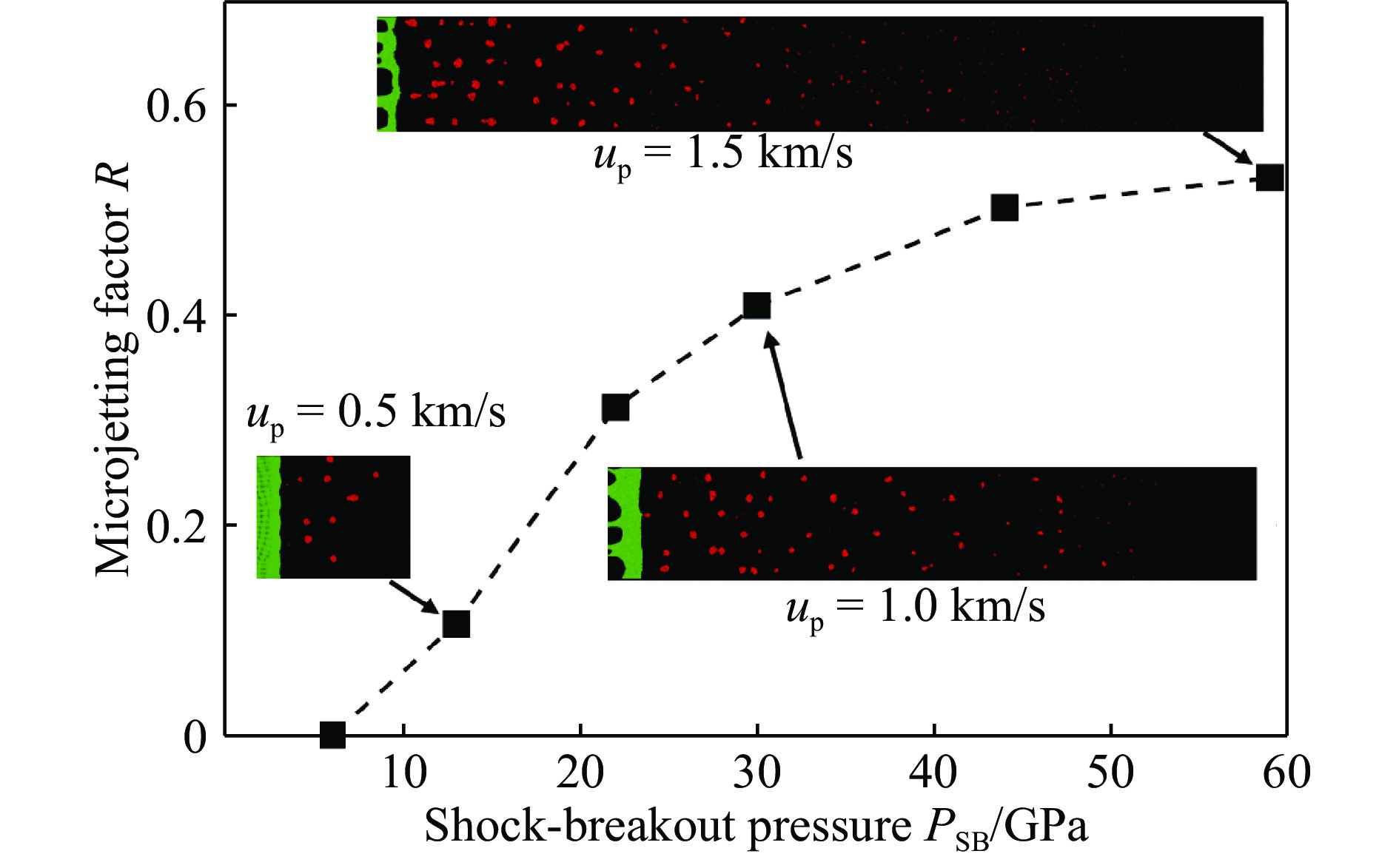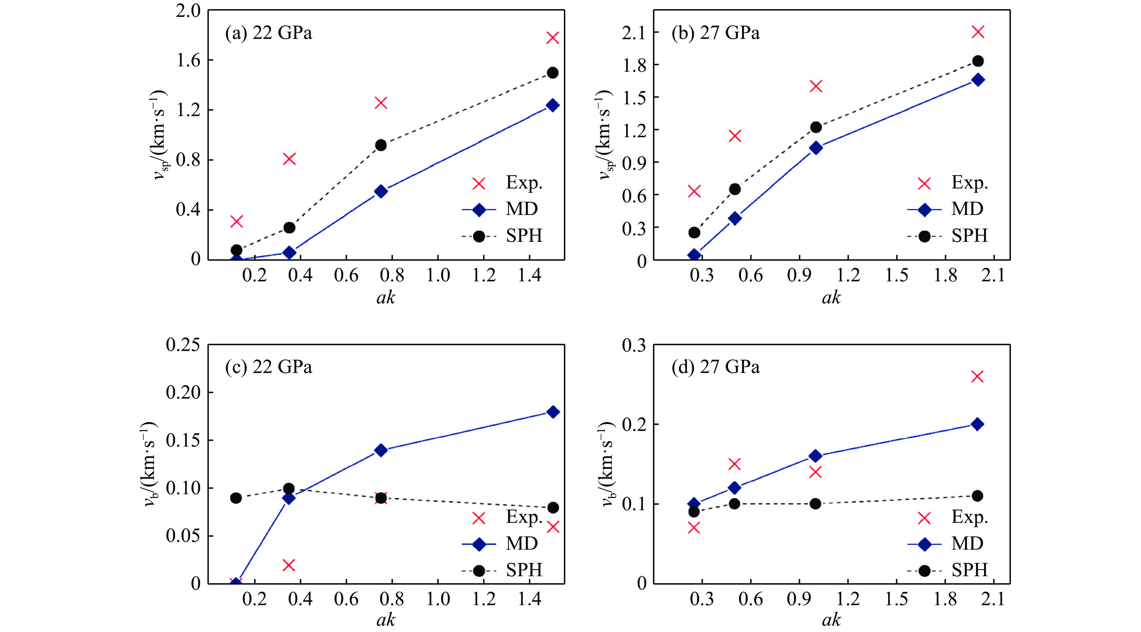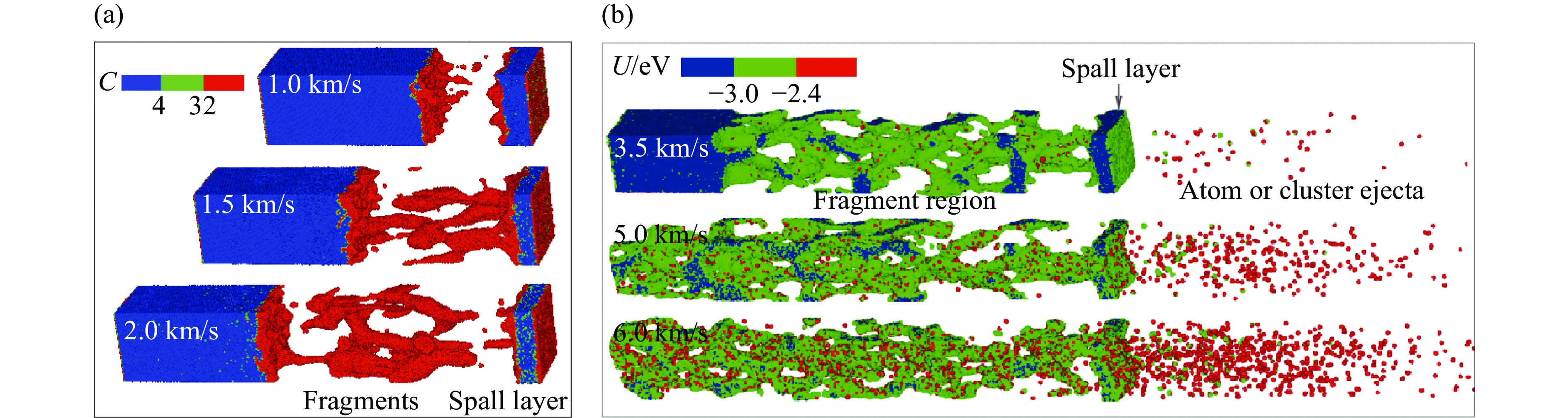 $\lambda $ 为三角波宽度,${\rho _{\rm{s}}}$ 和${\rho _{\rm d}}$ 分别为层裂片和破坏区的平均密度,${\rho _0}$ 为材料初始密度,${\sigma _{\rm s}}$ 和${\sigma _{\rm b}}$ 分别为层裂应力和冲击应力峰值。关于喷射物颗粒尺度的信息,可以采用幂律关系和指数关系来描述其终态分布,但其中主要参数的取值还很难从理论上确定。实际上,MD方法可以直接模拟出颗粒化全过程,但还局限于纳米尺度和极端应变率条件,与实际情况下的断裂颗粒还相差很大。而从CM角度,采用射流失稳断裂[73]、能量破碎等理论[74]可以对颗粒尺度进行估算,但这依然包含较多经验判据或参数,对实际状态下颗粒度的定量化分析仍然具有较高难度。
