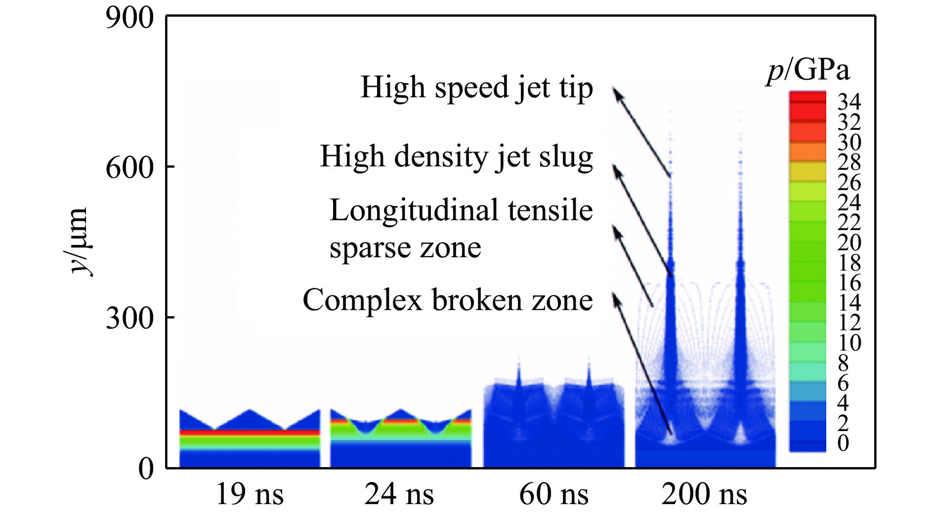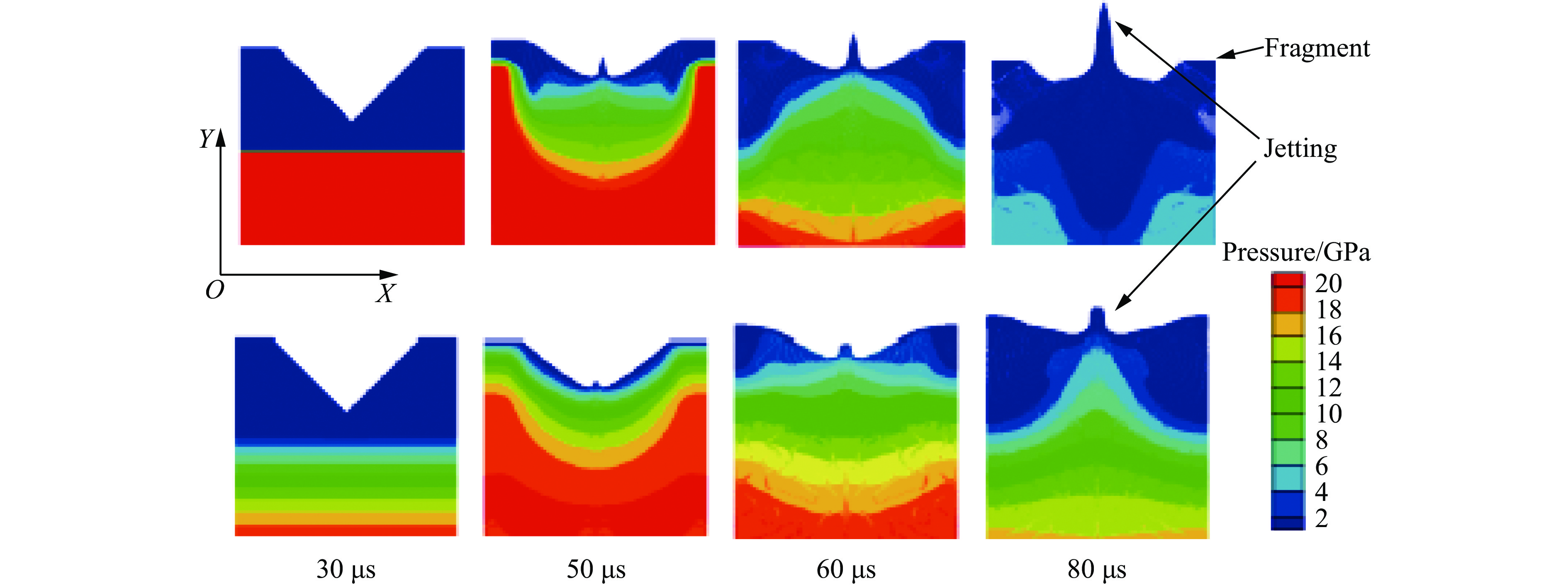 光滑粒子流体动力学(Smoothed Particle Hydrodynamics,SPH)方法是一种无网格的拉氏计算方法,易于处理大变形问题;欧拉数值方法把网格固定在空间上,允许物质的大变形和流动。至今,微喷射现象的CM模拟研究主要采用这两类方法。2004年,王裴等[54]采用SPH方法模拟了冲击加载下金属表面沟槽的射流现象,分析了喷射物的总质量、最大速度和质量-速度曲线,模拟结果与实验结果基本符合,表明SPH方法是模拟微射流的一种有效手段。图12为冲击加载(上)和具有一定加载波前沿宽度加载(下)的微射流形成过程。
