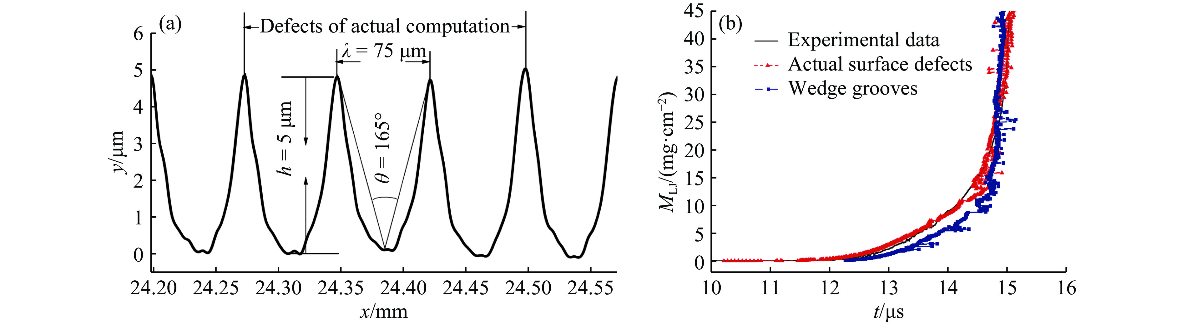 通过对微喷射现象的数值模拟研究,希望建立包含材料性质、表面状态及动力学条件等因素的喷射物质总量、质量-速度及颗粒尺度分布模型,以应用于工程力学问题的量化模拟中[6]。在早期研究中,Asay等[4]基于实验规律提出了一个由表面缺陷质量估算喷射总量的模型。韩长生[68]从经典射流理论出发,基于“等效金属罩质量”假设,推导了定常流动下冲击波与楔形槽表面正规与非正规反射条件下微射流质量的半经验公式。这些模型可以大致描述部分实验结果,然而由于模型过于简化,无法描述更宽范围的实验数据及其变化规律,比如,喷射物总量与缺陷深度、沟槽角度或波长的关系,更为严重的是无法反映熔化前后材料喷射状态的显著差异。