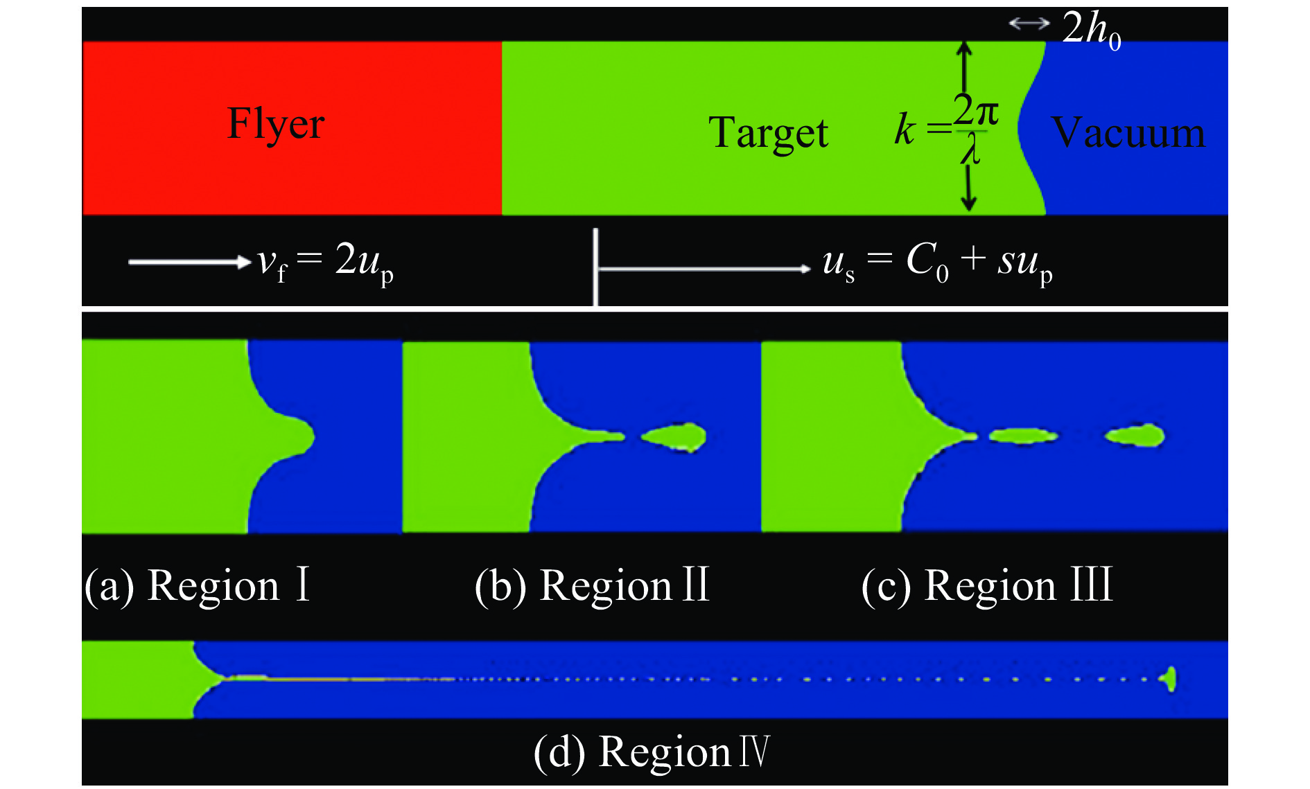 利用Los Alamos国家实验室开发的欧拉有限差分程序PAGOSA,Kullback等[61]模拟研究了不同扰动幅值、波数和几何形状情况下的微射流过程。图17给出了几种典型喷射状态,该模拟中采用了Mie-Grüniesen状态方程和弹性理想塑性强度模型。结果表明,总的微喷射质量取决于初始扰动幅值和波数的乘积。微喷射质量随该乘积呈现阶段性变化,且当该乘积超过某阈值时,喷射质量便呈现出单调增加趋势。此外,刘超等[62–63]采用二维弹塑性流体力学欧拉程序MEPH,模拟分析了不同形状、不同角度沟槽缺陷的最大喷射速度及喷射系数的变化规律,并进一步讨论了不同缺陷形状对喷射速度和喷射系数的影响。相关结论与前文SPH模拟和实验基本吻合。