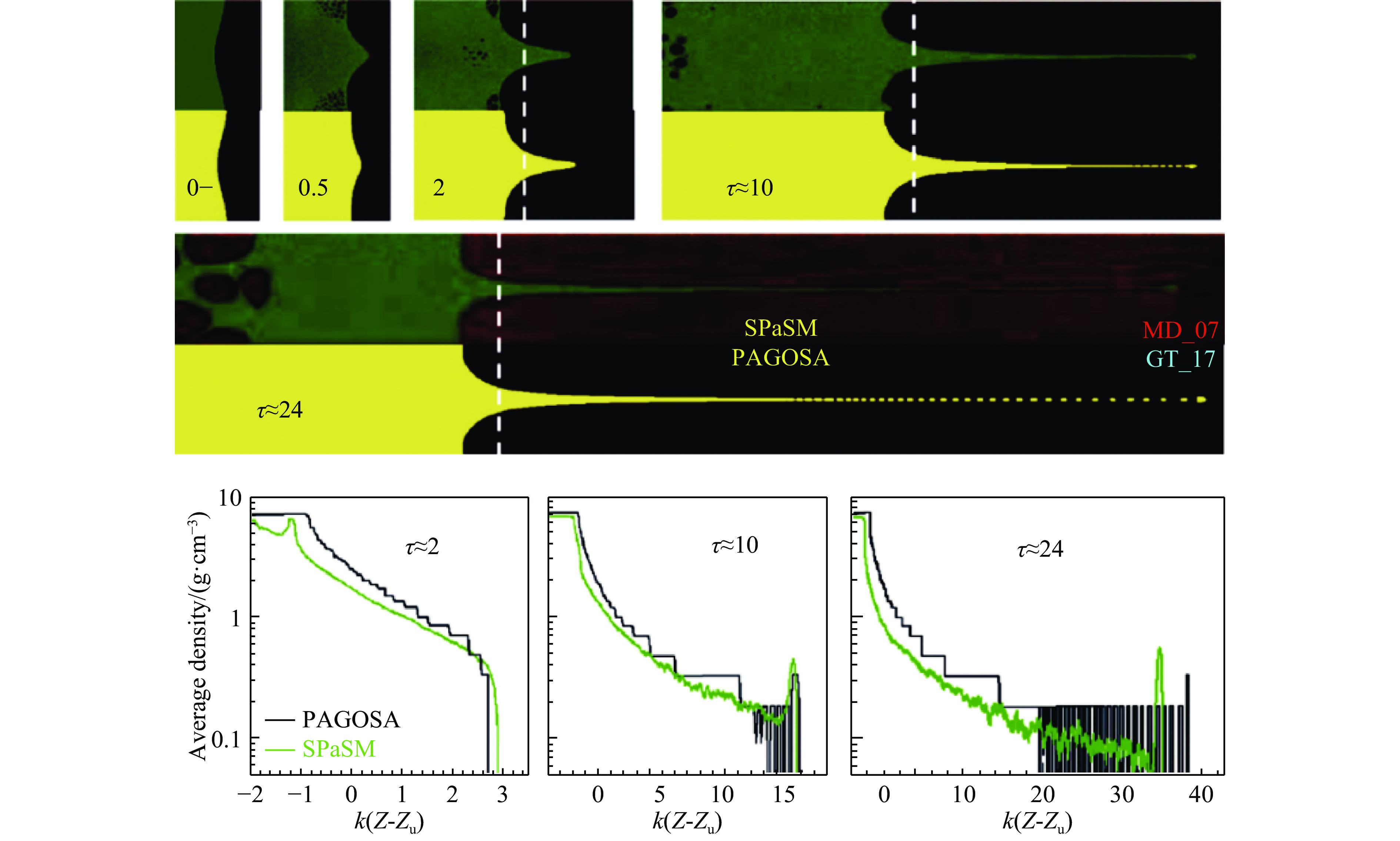 与此同时,其他更多工作也采用了MD和CM模拟的联合分析[66–67]。其中,Dyachko等[66]对锡样品进行了MD和SPH对比模拟,见图19,图中vsp和vb分别为尖钉和气泡的速度,ak表示扰动幅值。SPH模拟采用真实的实验尺寸,MD则采用比例缩放的样品尺寸。结果表明,MD和SPH模拟的射流速度和质量分布基本一致,表面张力对小尺度样品喷射射流的深刻影响可以部分解释MD和实验中观察到的峰值速度差异。此外,Durand等[67]采用大规模MD和CM模拟开展了相近尺寸的数值模拟。CM方法采用基于自适应网格细化的欧拉流体动力学方法,其状态方程由MD模拟得到。模拟结果表明,CM模拟得到的射流轮廓、质量和速度与MD方法所得结果一致,见图20,并指出材料的黏性和表面张力对CM模拟结果有很大影响,是CM建模中值得关注的问题。