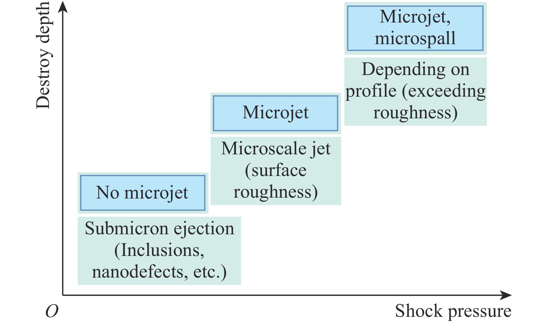 喷射物的产生不仅与表面缺陷相关,还显著地依赖于冲击压力、波形、材料强度与熔化等因素。随着冲击压力的升高,微喷射物理机制会发生转变,微喷射质量相应出现阶段性变化,如图3所示。实际中,微射流和微层裂是最主要的两种物质喷射机制。前者主要与表面缺陷相关,因聚能效应产生较高速度喷射物;后者是指材料近表面的动态拉伸破坏,主要取决于加载波形以及材料是否熔化。对于爆轰或激光等加载方式,冲击波一般为非持续的,此时微射流与微层裂都会发生。总的来说,微喷射过程涵盖了近表面区域的大变形、熔化与损伤断裂等一系列复杂物理问题。