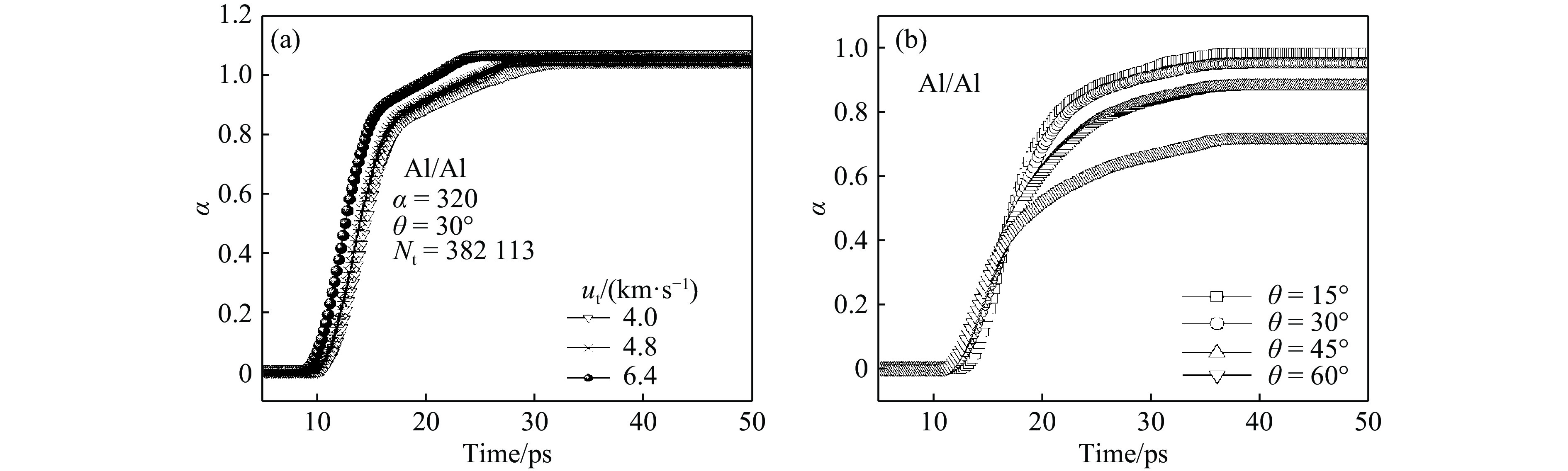 1993年,张景琳等[31]率先开展了微喷射现象的MD研究。受当时计算条件限制,该模拟采用二维计算模型和较简单的Morse两体势,给出了冲击压力和沟槽角度因素的定性分析,得到的喷射速度与自由面速度的比值在1~3之间。虽然未能给出喷射质量的变化规律,但已显示出MD方法的独特优势。2002年,陈军等[32]结合类紧束缚杂化多体势模拟了金属铜的微喷射现象, 基于模拟结果分析了沟槽表面的波系传播以及负压区和正压区的形成, 由此解释了沟槽产生微射流的动力学过程。2005年,陈其峰等[33]采用大规模MD模拟对喷射质量进行了统计分析,见图4,其中α为喷射系数,α=NE/Ng,NE和Ng分别为喷射粒子数和沟槽缺失粒子数。结果显示,熔化温度之下纳米沟槽射流的最大喷射系数约等于1,熔化温度之上喷射系数会大幅度增加。与此同时,美国Los Alamos实验室Germann等开展了更大规模的微喷射MD模拟,但至今未见详细报道,仅在文献[34]中展示了部分微射流形成及断裂的模拟图像。