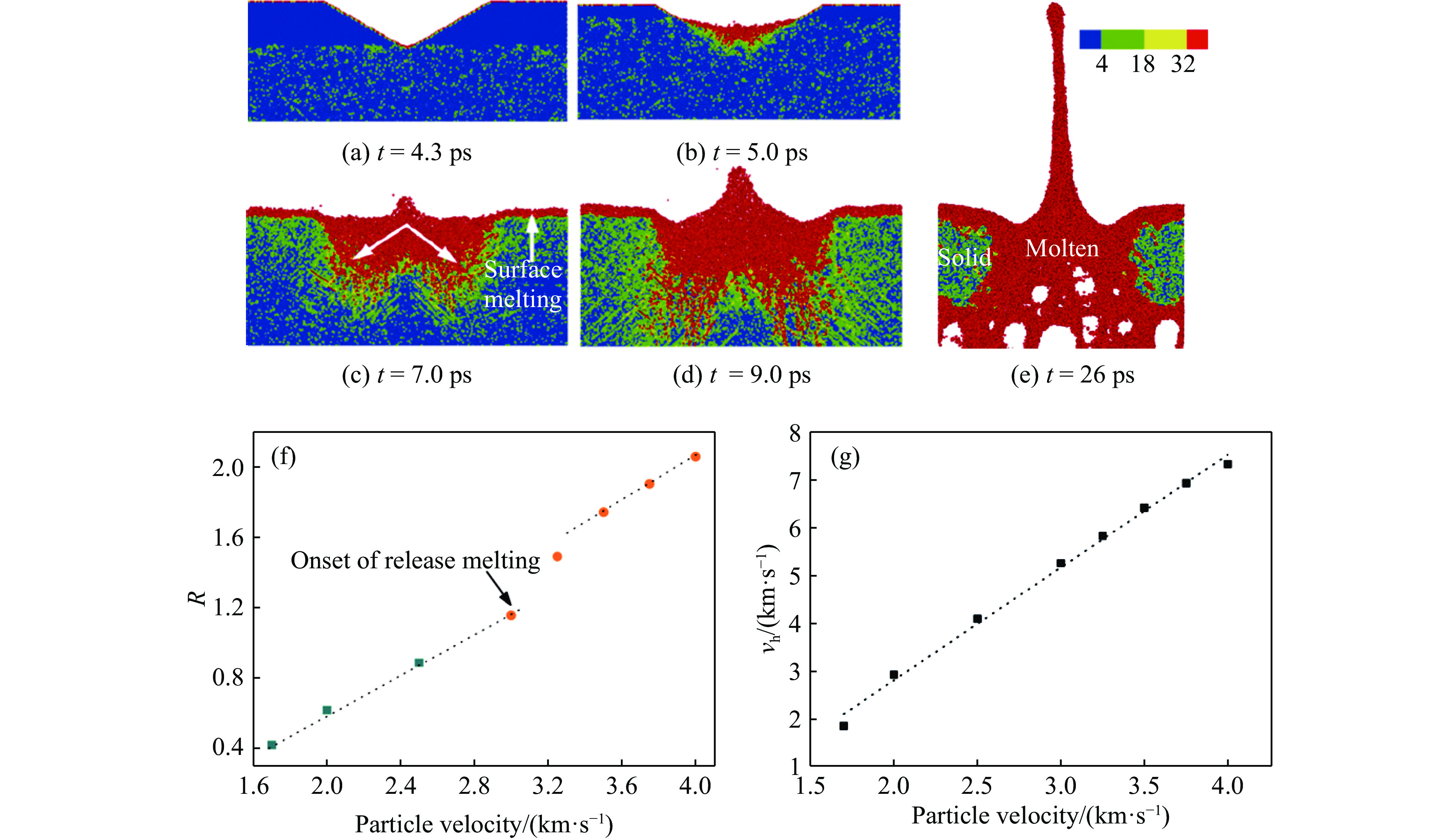 如前文所说,微喷射质量并不总是对应缺陷质量。对此问题,邵建立等[35]基于铝的势函数模型,模拟分析了不同冲击压力下的微射流形成过程,重点探讨了材料熔化的影响机制。模拟结果反映了缺陷塌缩局部熔化、卸载和冲击熔化等物理过程。例如,图5给出了典型卸载熔化(红色区域)时的射流喷射图像,图中颜色对应原子中心对称参数值。由此可解释熔化导致喷射质量显著增加的部分原因。此外,模拟结果还显示,最大喷射速度对材料是否熔化并不敏感,这与后来的实验结果[36]是一致的。其原因在于,头部喷射物源于沟槽底部区域,这些物质从早期塌缩便处于熔化状态,卸载熔化则主要影响射流根部物质的流动。