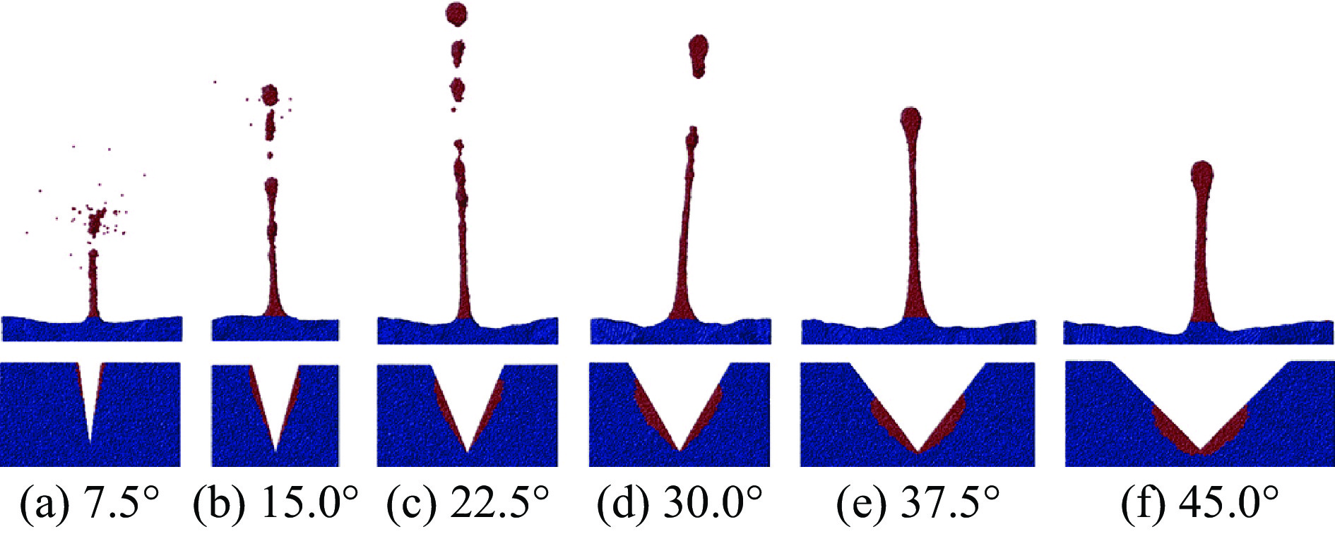 除冲击压力以外,材料表面形貌是影响微射流发展的另一重要因素。叶建军等[37]基于金属铜的MD模拟,定性比较了楔形、圆形和方形沟槽产生的射流,结果表明,楔形缺陷更容易发生微喷射,且喷射速度随着楔形角的增大而减小。2014年,李博等[38]对沟槽角度及缺陷形状进行了序列化MD模拟分析。结果显示,最大喷射速度与自由面速度之比随着半角增加呈线性减小,且不同材料和不同尺度具有相似比值,但喷射系数则在某个中间角度达到最大值。图6为2 km/s 碰撞速度下不同沟槽角度的喷射图像及其物质来源比较。此外,模拟结果还显示,晶体结构或缺陷形状的不对称性可引起射流方向的较大改变。