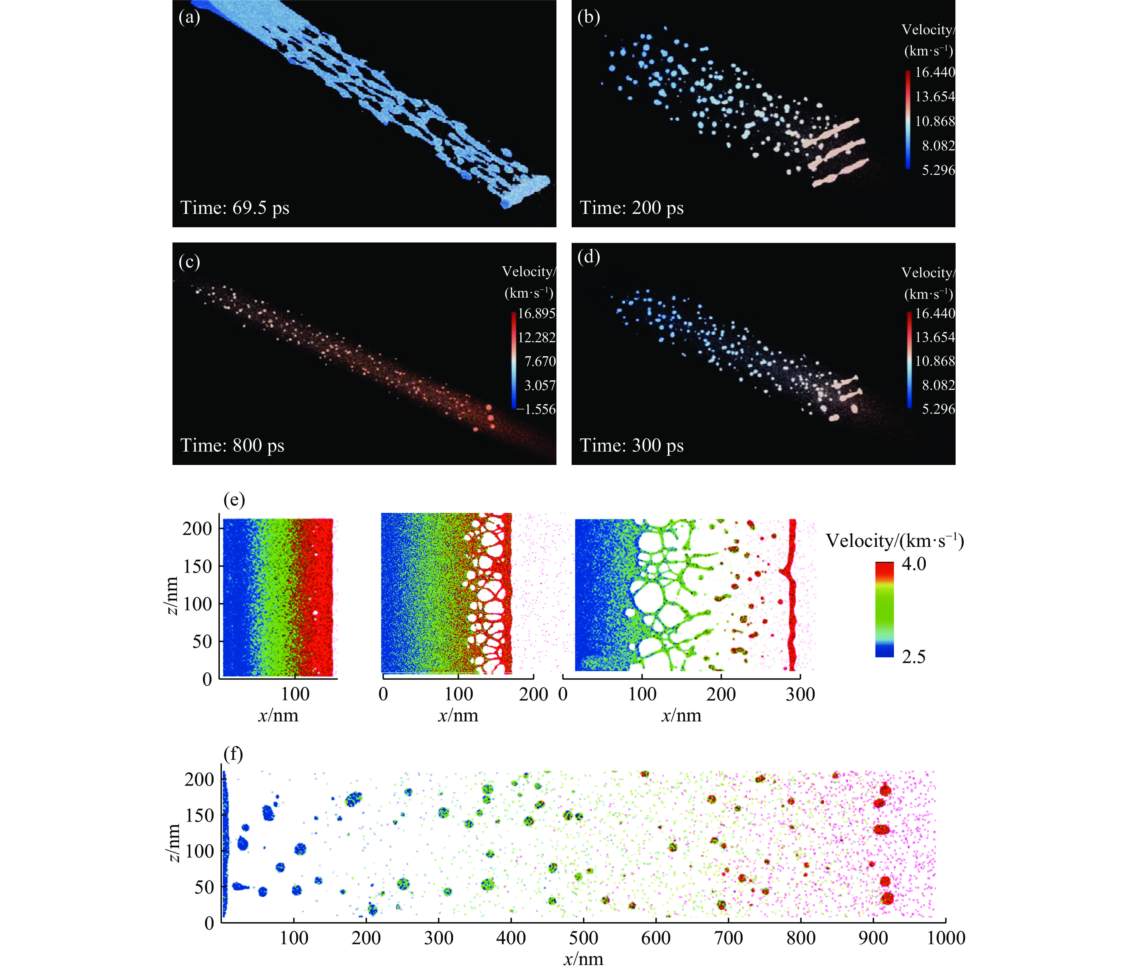 在速度梯度作用下,微射流最终将断裂成一定的颗粒分布状态。Durand等[39]基于金属铜的长时演化模拟研究了微射流断裂颗粒尺度分布,其结果显示喷射颗粒最终会保持球形,尺寸分布呈幂律关系,这与碎片化过程的大多数测量非常一致。之后,通过进一步对金属铜和锡不同表面扰动幅值下微射流破碎[40]模拟发现,小尺寸极限服从幂律分布,而大尺寸极限服从指数分布。与此同时,何安民等[41–43]开展了冲击强度与沟槽尺寸等因素的系列模拟分析,详细阐述了喷射颗粒存在的不同分布形式。结果表明,较小尺度颗粒服从包含不同特征常数的幂律分布,而较大尺度颗粒则更满足双指数分布。图7给出了金属铜微射流破碎过程的MD模拟图像,颜色表示粒子速度[39, 43]。近期,吴凤超等[44]模拟研究了气体环境下喷射颗粒的形成和演化过程,因涉及物质混合过程,此处不再更多介绍。