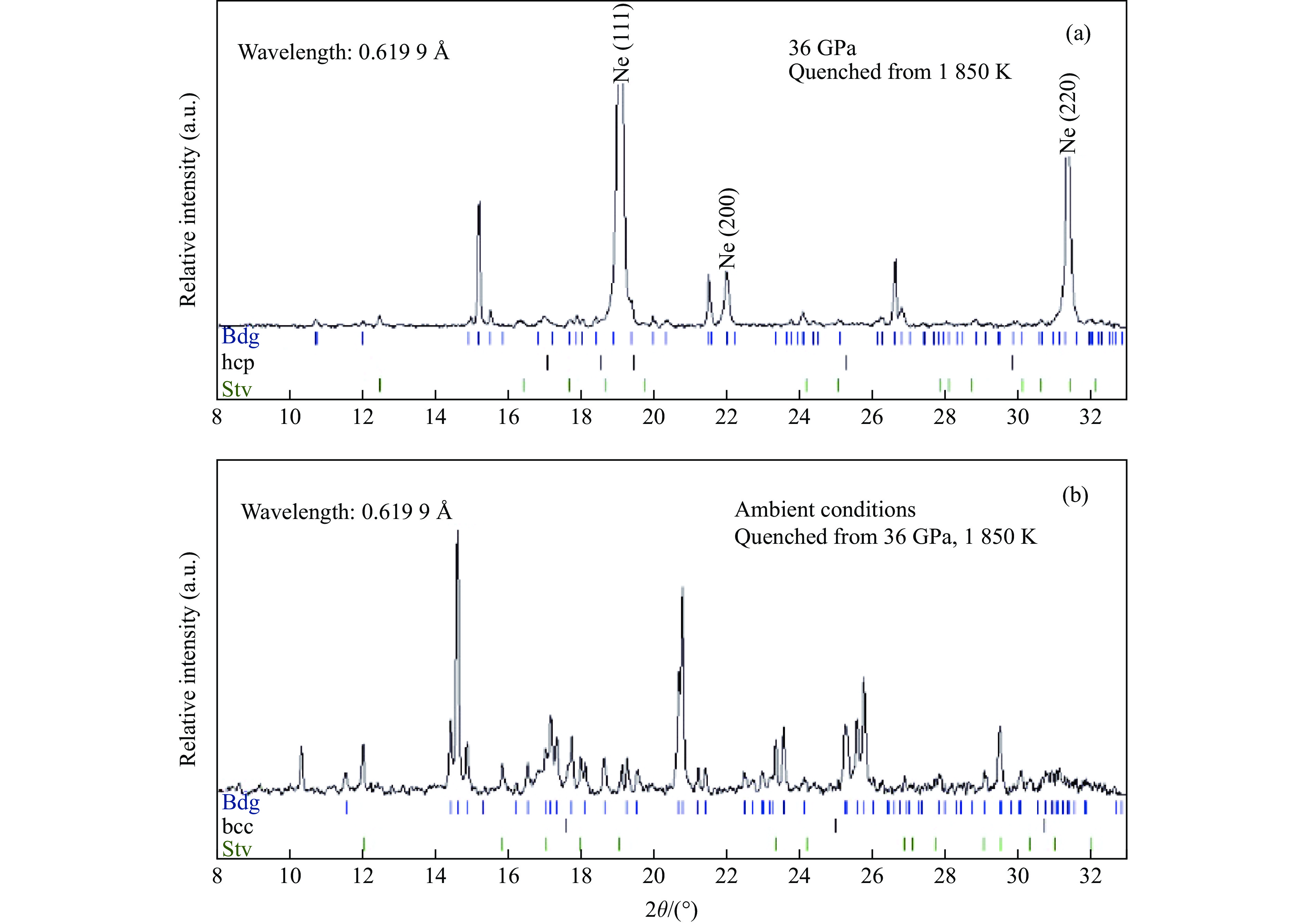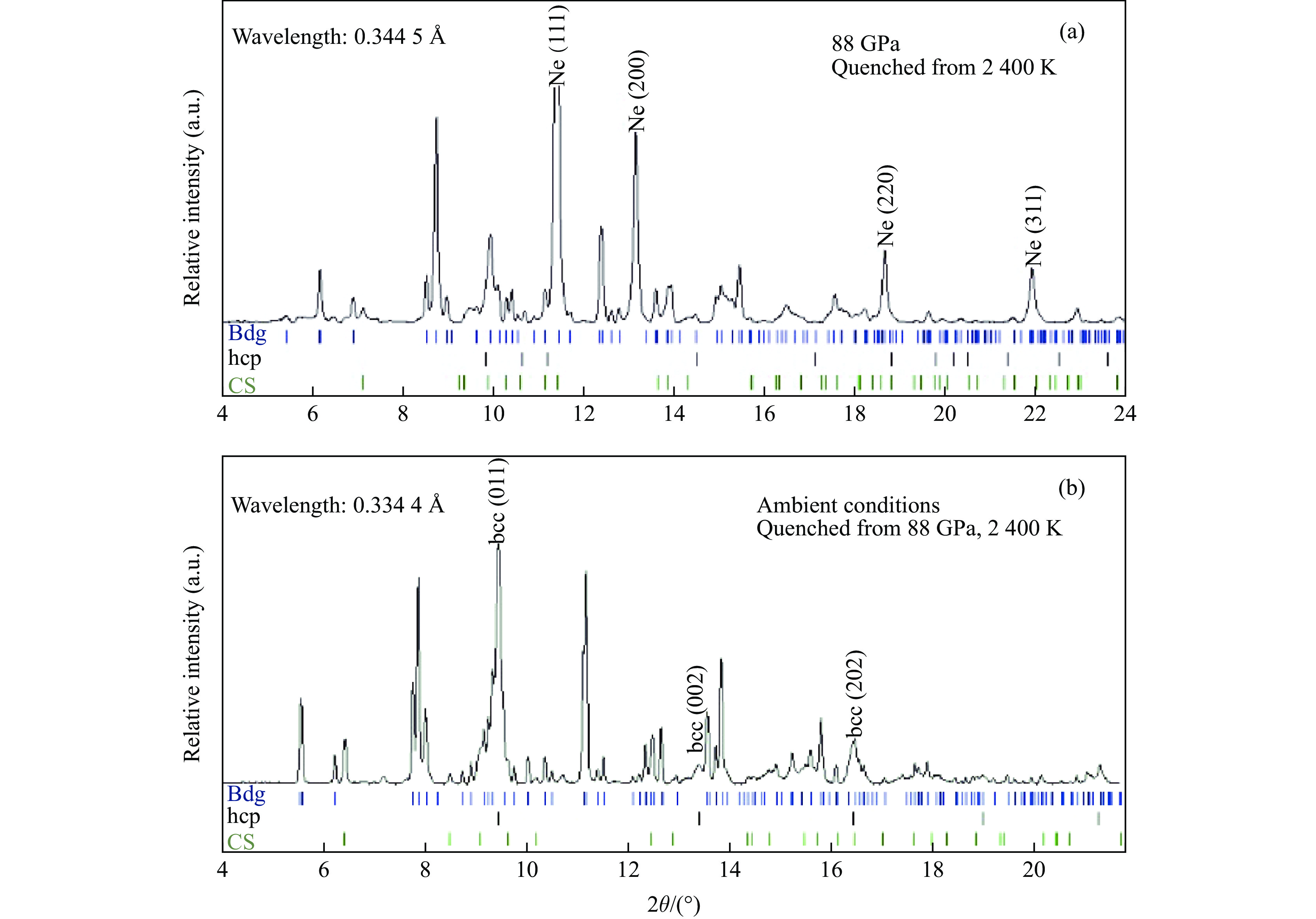 表1列出了实验的温压条件、所采用的传压介质和压标,以及XRD谱中识别出的实验产物。对于压力为36~88 GPa的4组实验,在其高压原位XRD谱中除了压标和传压介质(Ne/Au)的衍射峰外,识别出的主要共存相为布里奇曼石和二氧化硅;其中88 GPa、2 400 K条件下合成的Sa104-1样品中二氧化硅呈现CaCl2型结构,在其他较低压力下合成的样品中二氧化硅为金红石结构(斯石英)。卸压至常温常压条件下,Sa104-1、Sa82-1和Sa104-2样品的衍射谱中,除了布里奇曼石和二氧化硅外,识别出体心立方(bcc)结构的金属铁。图2和图3分别显示了具有代表性的两组实验(Sa104-1、Sa104-3)在高压原位和常温常压下的XRD谱,其中Bdg代表布里奇曼石,CS代表CaCl2型结构的SiO2,Stv代表斯石英。