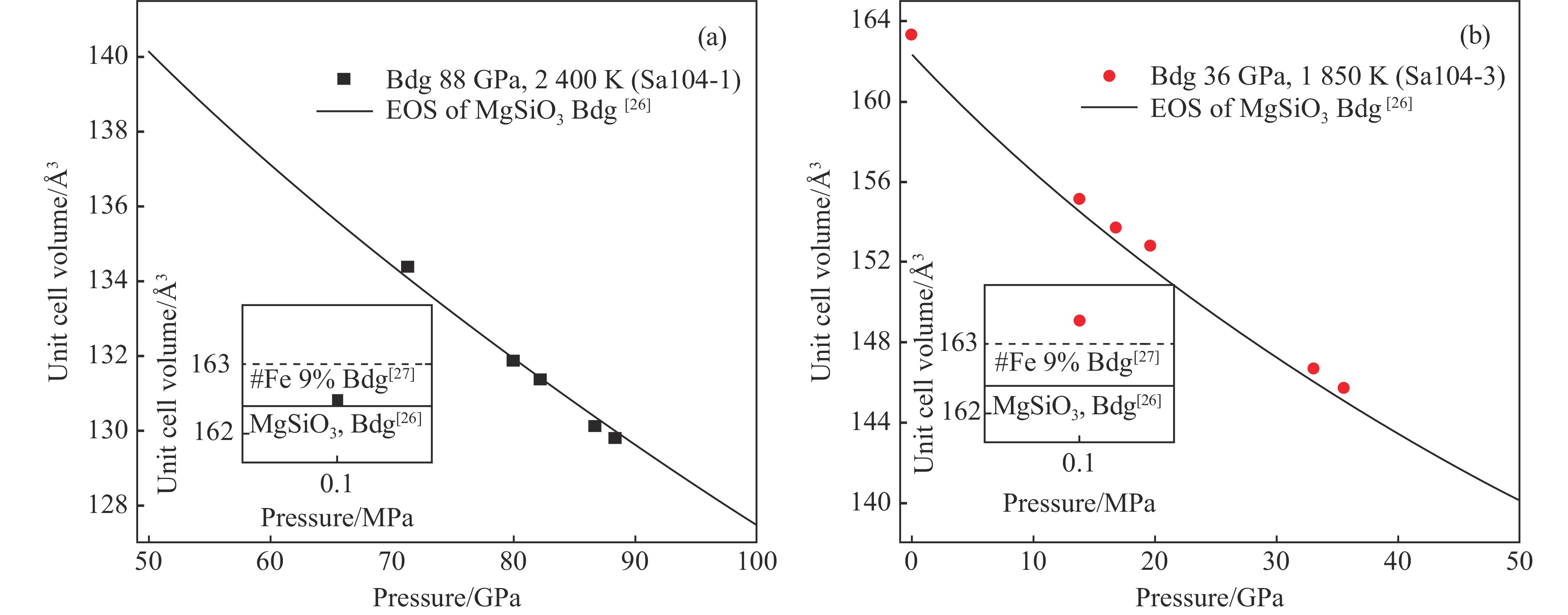 表2显示了实验产物中布里奇曼石的晶胞参数在卸压过程中随压力的变化。通过UNITCELL软件[25]对晶胞参数进行拟合,在每个衍射谱提取10~15条衍射峰的d值,用以拟合晶胞参数。图4分别展示了Sa104-1和Sa104-3样品中布里奇曼石的晶胞体积随压力的变化以及与文献资料的比较,两组实验使用了相同的传压介质和压标。