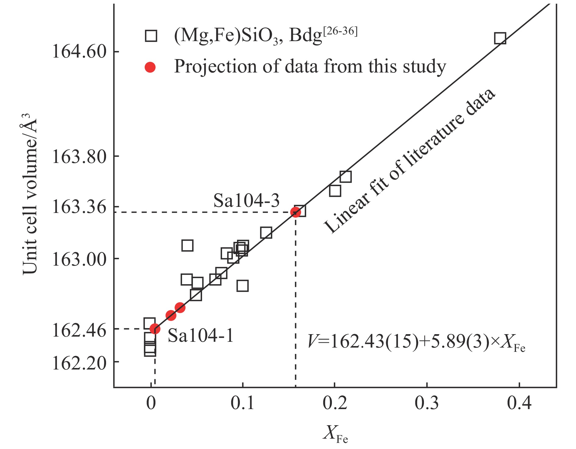 图5中统计了文献中(Mg,Fe)SiO3布里奇曼石中的含铁量(XFe)与常温常压下的晶胞体积(V)之间的关系[26-36],其中XFe=n(Fe)/[n(Fe)+n(Mg)](n为原子数),在整个数据范围(XFe≤38%)内XFe-V呈现出很好的线性相关性。线性拟合得到的结果为V(Å3)=162.4(2)+5.89(3)XFe(见图5)。据此可以估算得出,本研究中压力在42 GPa以上的条件下合成的布里奇曼石(Sa104-1、Sa82-1和Sa104-2)相对初始样品成分出现了显著的铁亏损,在最高压力条件下合成的布里奇曼石(Sa104-1)的含铁量约1%,Sa82-1和Sa104-2的含铁量分别为3(1)%和2(2)%;而在36 GPa、1 850 K条件下合成的布里奇曼石的含铁量为16(2)%,与初始样品的含铁量相当,未出现铁亏损。结合XRD数据可以发现,布里奇曼石中的铁亏损(Sa104-1、Sa82-1和Sa104-2)同时伴随着体系中金属铁的析出。