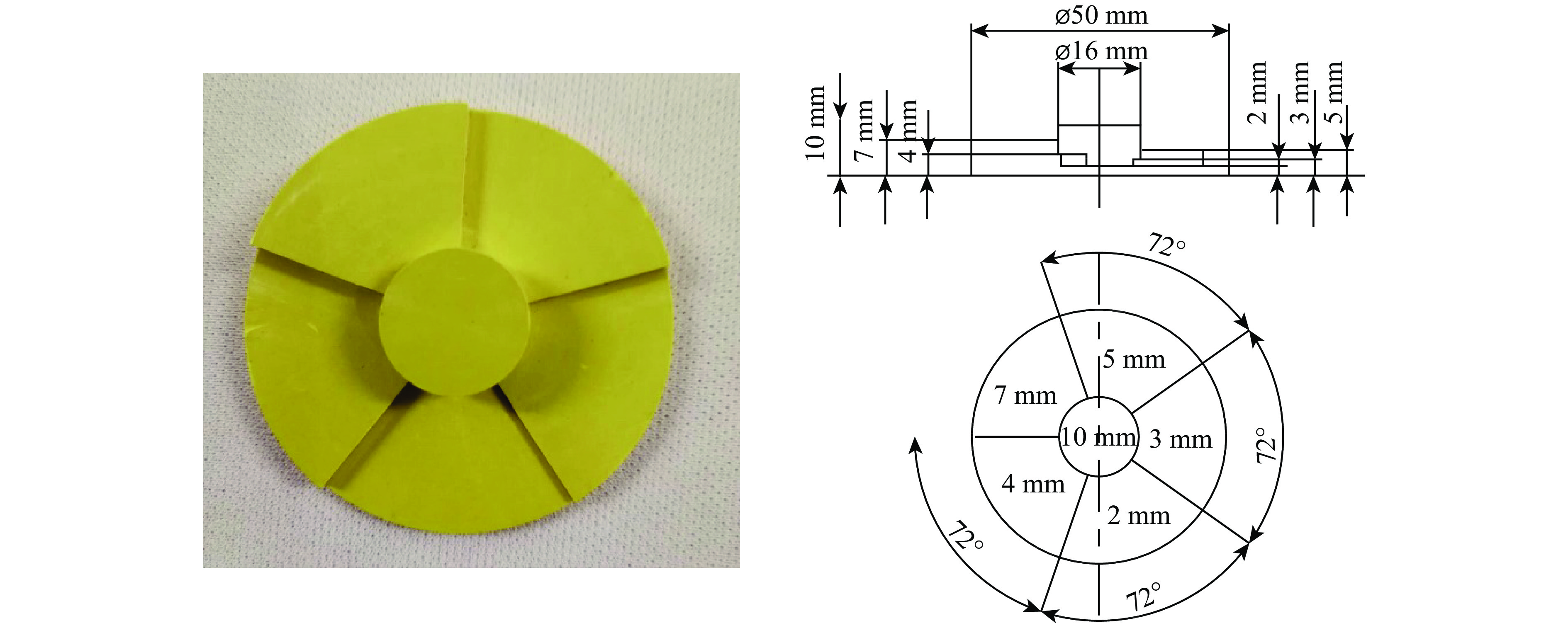 $\varnothing $ 50 mm × 30 mm的 A型炸药,使其达到爆轰状态,爆轰波通过厚度为0.3 mm的空气间隙到达金属隔层,用PDV测量金属隔层自由界面速度,金属隔层自由界面速度的变化可以反映传爆药和金属隔层间的空气间隙对冲击波的影响,通过界面速度计算出透射压力,再根据入射压力得到金属隔层的冲击波透射率。其次,如图2(b)所示,在金属隔层后贴合如图3所示的台阶型B型炸药,台阶厚度分别为2、3、4、5、7和10 mm,每个台阶面粘贴尺寸为$\varnothing $ 15 mm × 11 mm 的LiF窗口,通过PDV测速系统测量每个台阶样品和LiF窗口的界面速度,根据速度的变化,判断炸药的反应情况,得到传爆药和金属隔层间的空气间隙对冲击起爆的影响。最后,在金属隔层和B型炸药样品间增加一个0.22 mm厚的空气间隙,与上一过程中PDV测速系统测量得到的界面速度进行对比,得出金属隔层和B型炸药样品间的空气间隙对冲击起爆的影响。实验条件如表1所示。