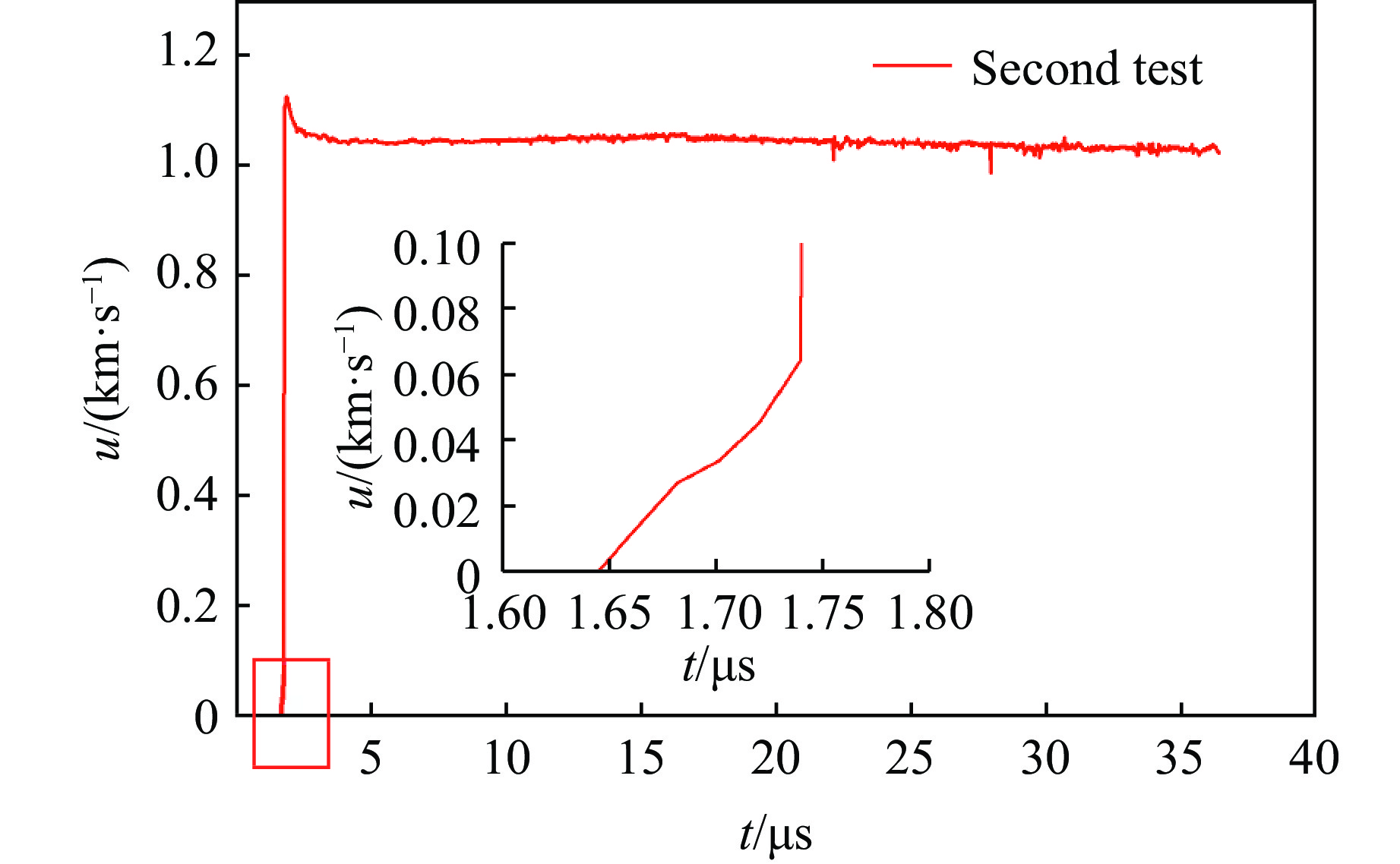 图5为图4中第3个点的速度开始增长时前面部分的放大图像。由图5可知,金属自由界面粒子速度刚开始增长的时候,并不是直接跳跃至最高点,而是经过一段平滑的曲线增长。这是由于在金属隔层和传爆药之间存在厚度为0.3 mm的空气间隙,当冲击波通过空气间隙时,对空气进行压缩,金属隔层压力的增加是连续的,可以把这个过程看作是对金属隔层进行准等熵压缩。