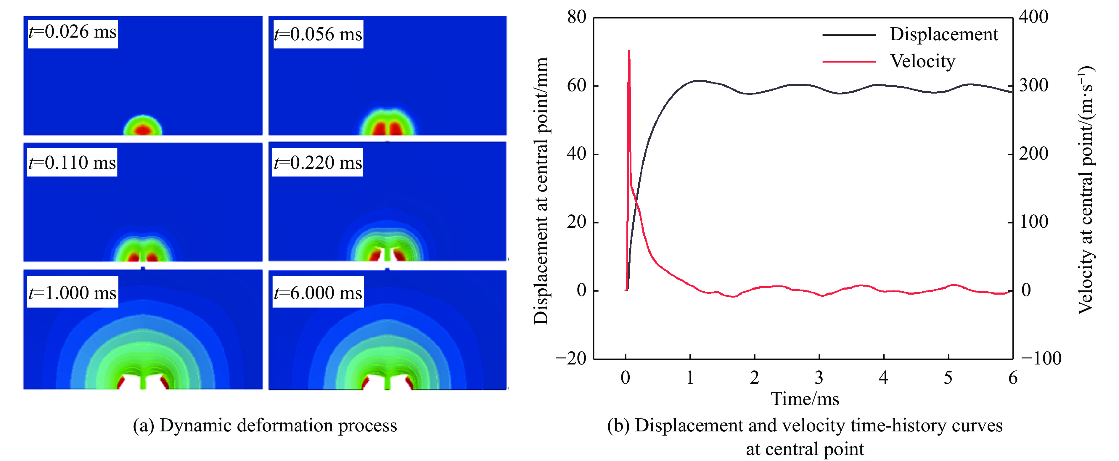图10(a)所示为加筋板在不同时刻的变形破坏情况。可以看出,0.026 ms时,爆炸冲击波传递到试板位置,试板迎爆面中心区域开始发生变形;随着爆炸载荷的持续作用,加筋的存在对面板的变形开始起到约束作用;0.056 ms时,面板的最大变形出现在加筋两侧,加筋两侧形成轻微鼓包;0.110 ms时,面板加筋两侧出现对称撕裂破坏;0.220 ms时,面板加筋两侧的撕裂破口开始向周围翻转;1.000 ms时,试板中心区域出现明显的对称花瓣撕裂破口;6.000 ms时,试板变形破坏情况与1.000 ms时基本保持一致,结合图10(b)中加筋中心点处的位移/速度时程曲线可知,此时试板的变形破坏情况已经稳定。