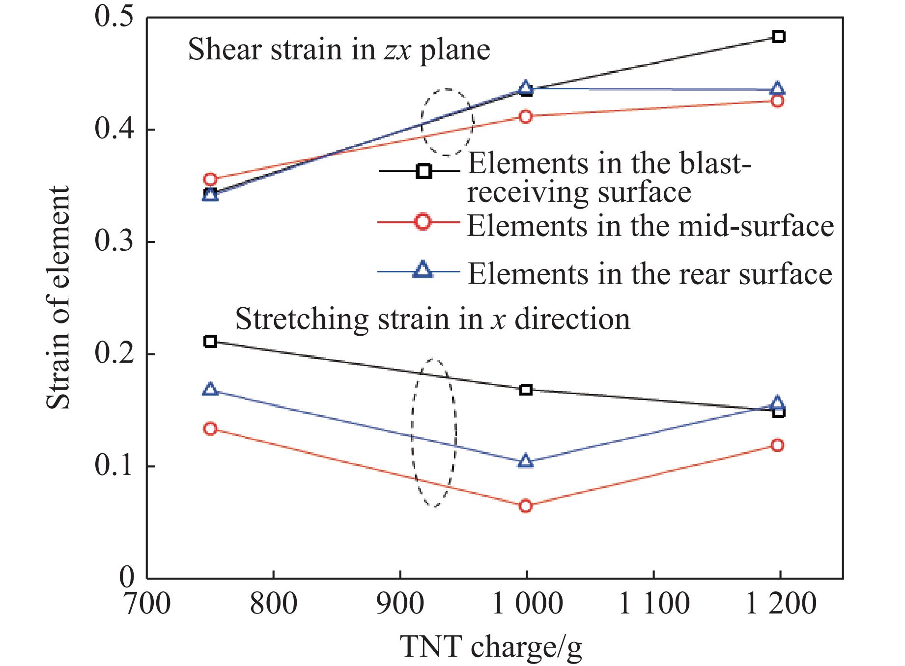 对高韧钢方形平板各选取单元的应变情况进行分析,可知近距空爆载荷作用下,平板沿板厚方向各单元x方向的拉伸应变最大,迎爆面单元zx平面有明显的剪切应变,但背爆面区域单元的剪切应变很小。整体沿厚度方向zx平面的剪切应变远小于试板所受的拉伸应变,说明高韧钢方形平板的失效模式主要为拉伸撕裂破坏。