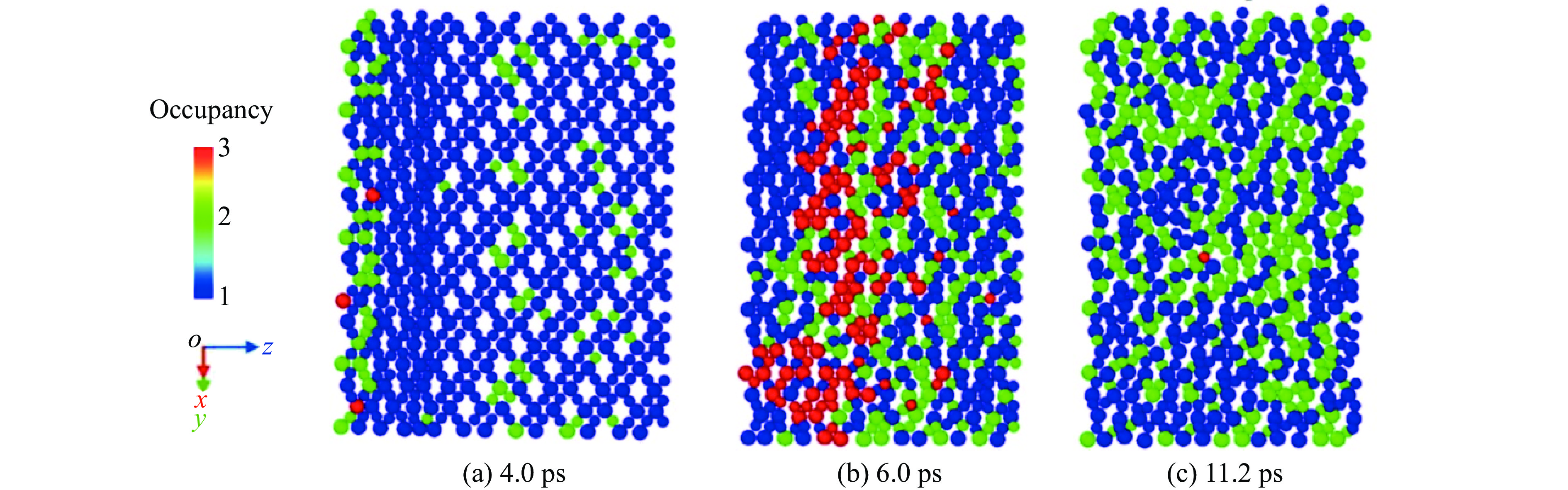 为探究11.2 ps时应变局域化现象是如何形成的,进一步追踪了冲击压缩过程中原子位置的变化,结果如图9所示。4.0 ps时,冲击波阵面抵达目标区域(图8中红色方框区域),挤压该区域中的原子,如图9(b)所示; 6.0 ps时,冲击波阵面已扫过目标区域,冲击加载作用使沿冲击方向的原子间距显著减小,但原子的排列形式并没有发生变化,如图9(c)所示;11.2 ps时,绿圈内2个氧原子的排列形式发生了变化,由初始时刻的水平排列变为上下排列,如图9(d)所示,说明该局部区域发生了结构变化。采用OVITO软件中的Wigner-Seitz缺陷分析,得到的结果如图10所示,其中:Occupancy 1表示未离位的原子,Occupancy 2表示间隙原子,Occupancy 3表示有2个间隙原子。可以看出,由于冲击压缩作用,4.0 ps时出现间隙原子;随着冲击加载的进行,6.0 ps时2个间隙原子出现的概率逐渐增多;之后,由于应力释放,2个间隙原子出现的概率逐渐降低;11.2 ps时,只有一个位置出现了2个间隙原子,而该位置上的一个原子恰好对应图9中绿圈内的2个氧原子之一,同时,样品内部沿[