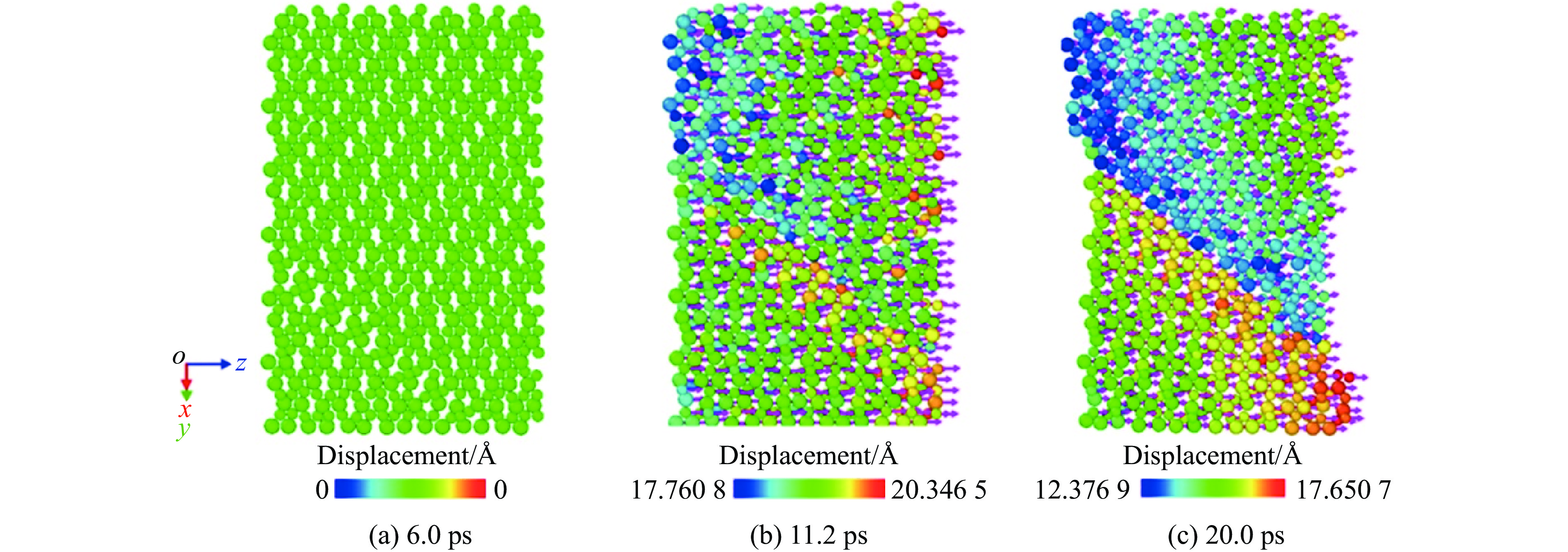 $01 \overline 11 $ ]方向发生了剪切作用,导致2个氧原子的相对位置发生改变。以6.0 ps时原子的位移作为参考,对11.2和20.0 ps时原子的位置进行位移矢量分析,结果如图11所示。以6.0 ps时刻作为参考,箭头代表对应原子的位移方向,箭头长短和原子颜色代表位移大小;大球为铝原子,小球为氧原子。11.2 ps时,在所考察区域内原子沿冲击方向的位移大小已呈现出较为明显的空间差异;20.0 ps时,在所考察区域内原子位移场可分为上、下两部分,两者之间存在位移突变,即发生了滑移,滑移方向为[