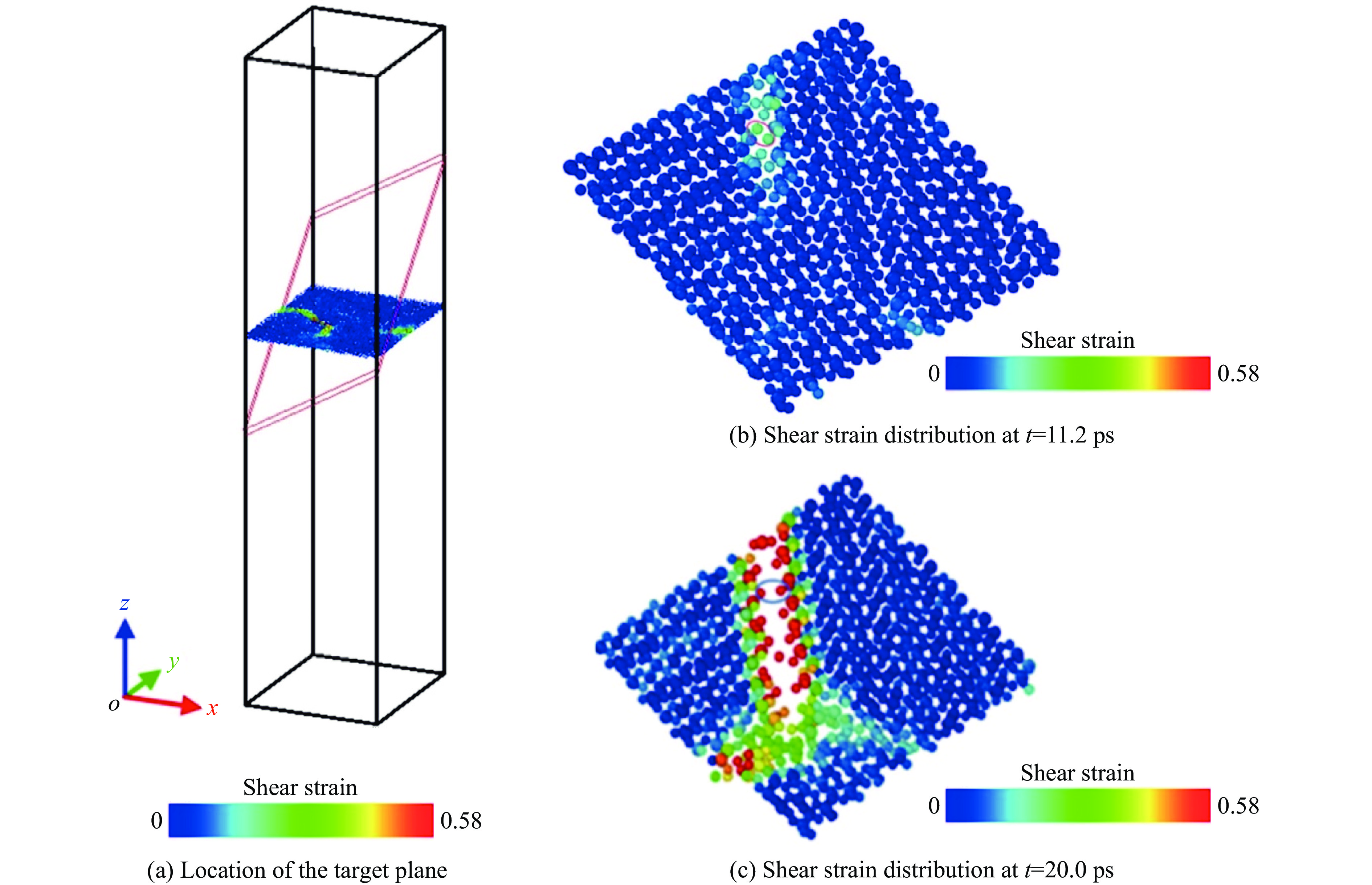 Figure 12. Shear strain distributions in the cross-section plane perpendicular to the impact direction: (a) schematic diagram of the location of the target plane; (b) shear strain distribution at t=11.2 ps; (c) shear strain distribution at t=20.0 ps
