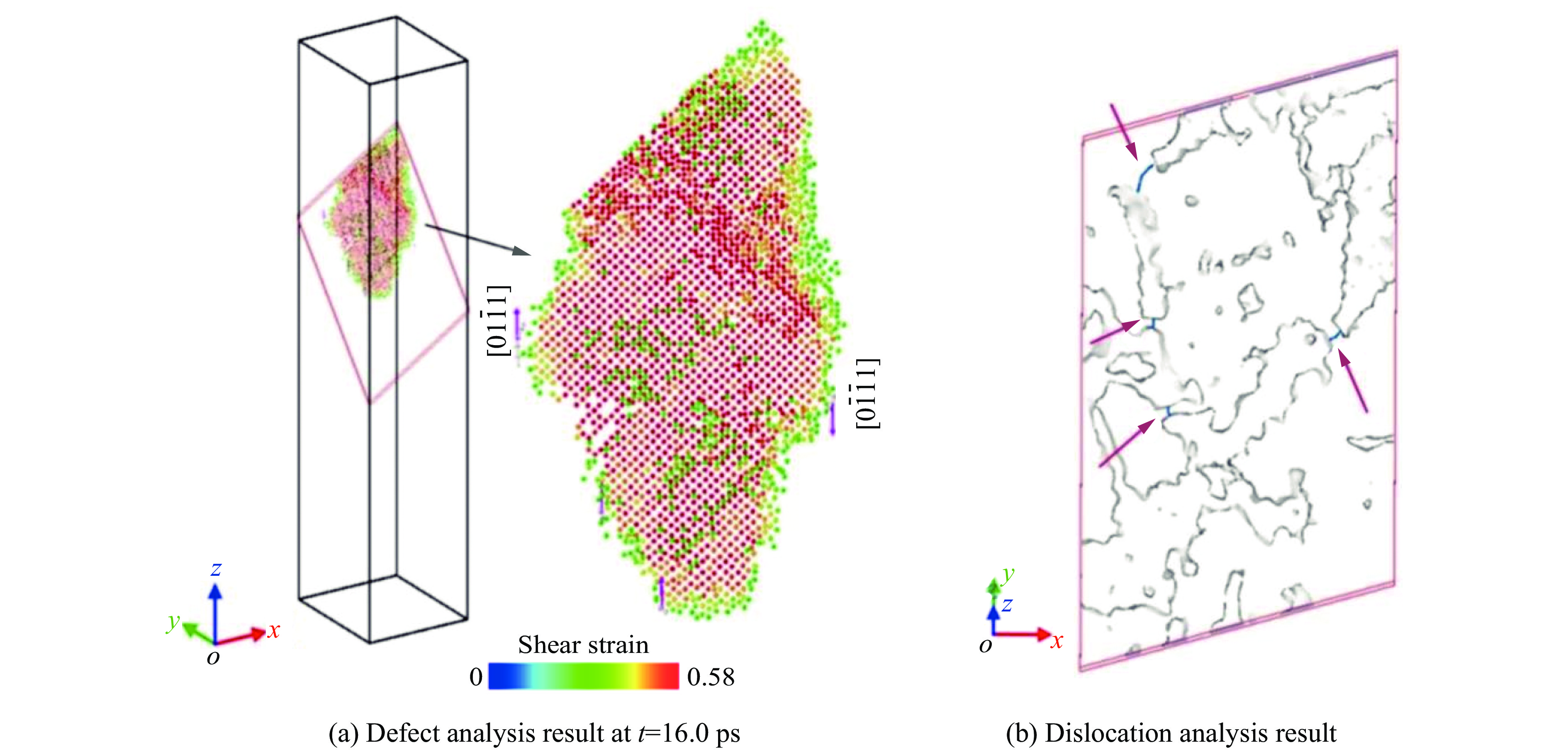 进一步分析滑移面上的缺陷。由于11.2 ps时尚未出现滑移现象,而20.0 ps时已发生滑移面相交,因此,选择16.0 ps时的原子排列作为代表进行分析。图13(a)给出了滑移面(